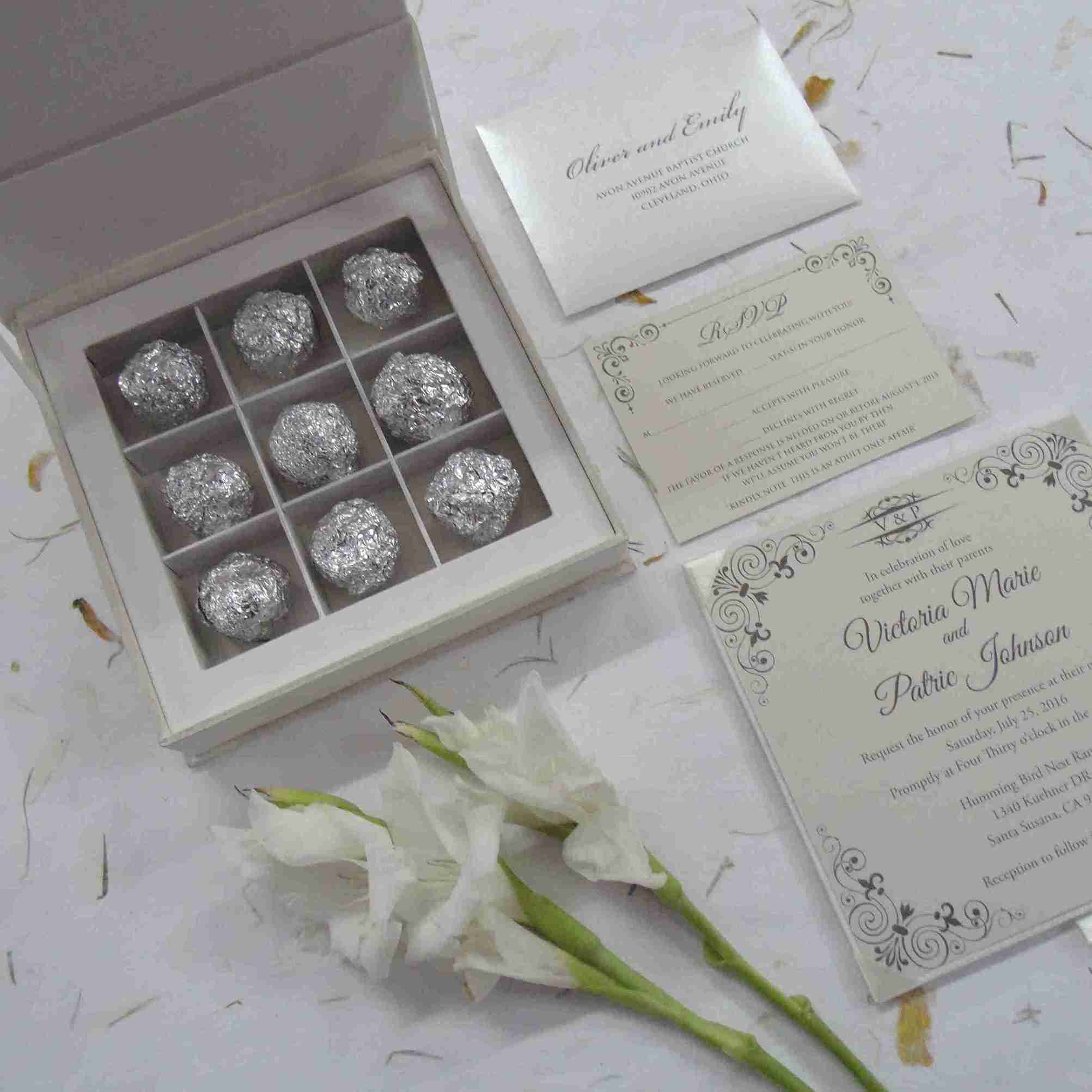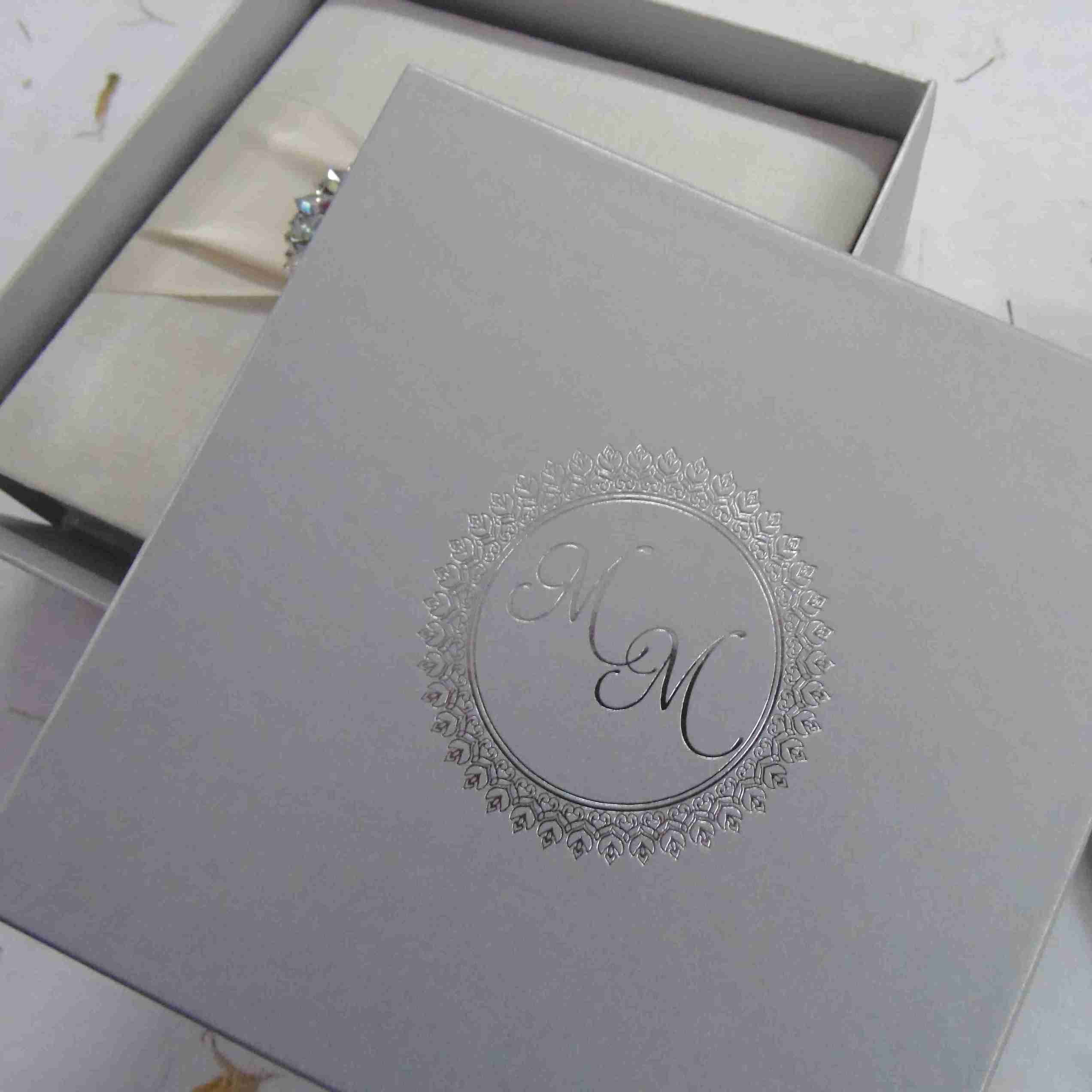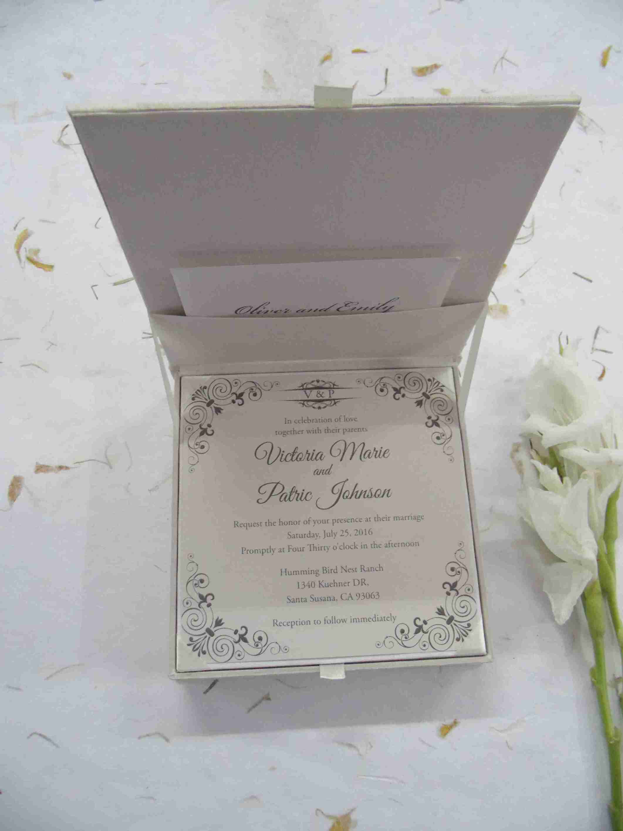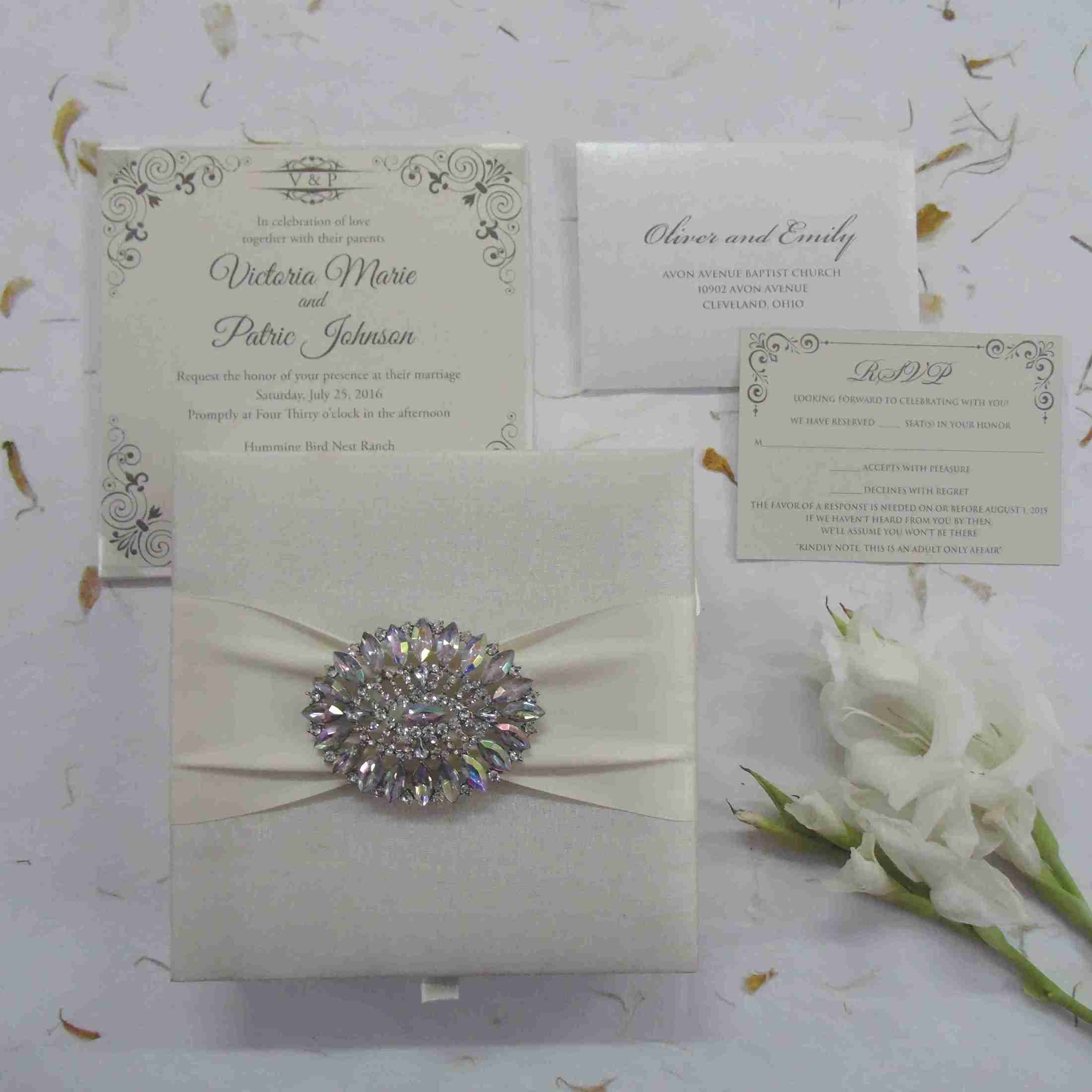 πβππ πππππβπΎ πββπππ»πΌπ: A silk wedding invitation box with a rhinestone brooch on a double trim satin ribbon. The box comes with a silk cardholder that carries a foil printed invitation insert. Beneath silk cardholder lies the space for chocolate tray.