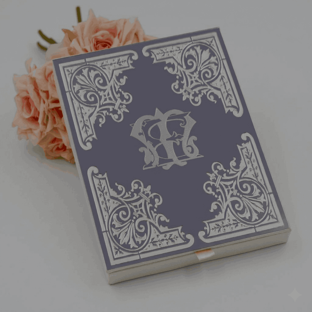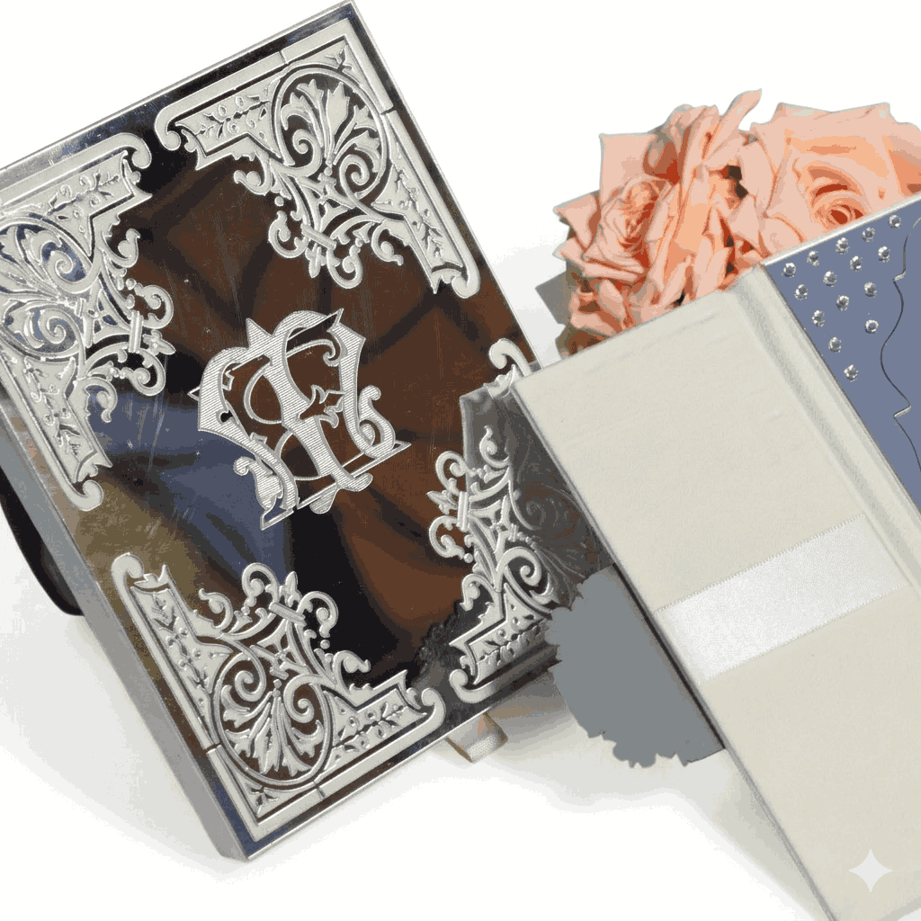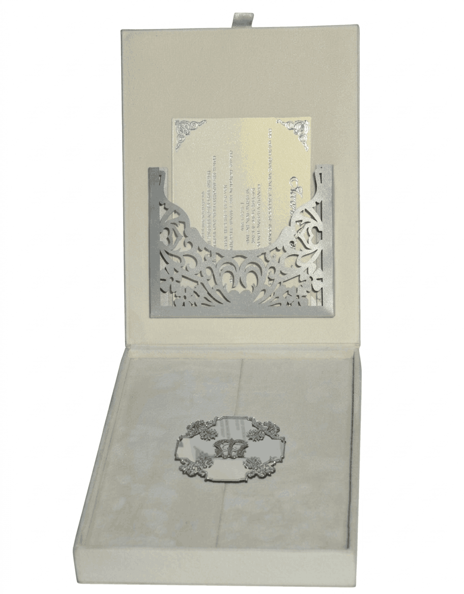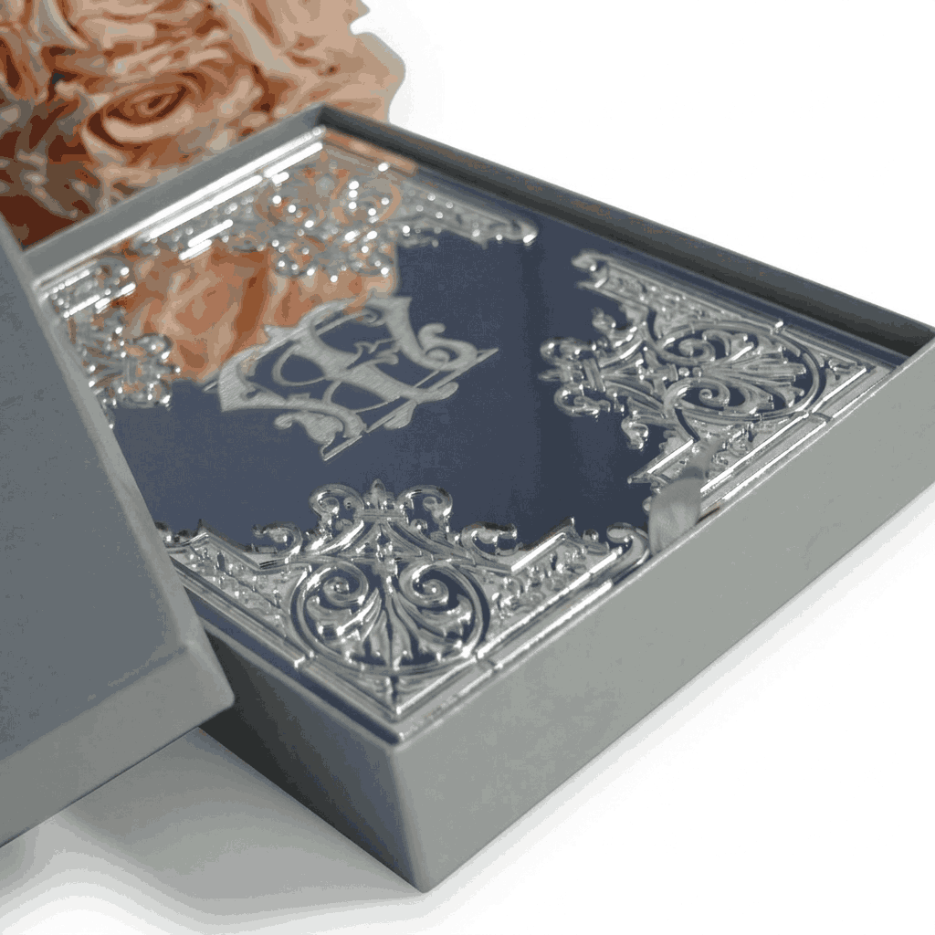 πβππ πππππβπΎ πββπππ»πΌπ: A beautiful velvet wedding invitation box with engraved mirror acrylic top with an electroplated custom monogram. The box comes with a velvet bi-fold folio with a mirrored acrylic and electroplated monogram. Further, the folio has a mirrored acrylic invitation inside adorned with rhinestones. This wedding invitation box has a laser cut designed pocket on the lid for additional enclosure card inserts. This invitation comes inside a hardboard mailing box.