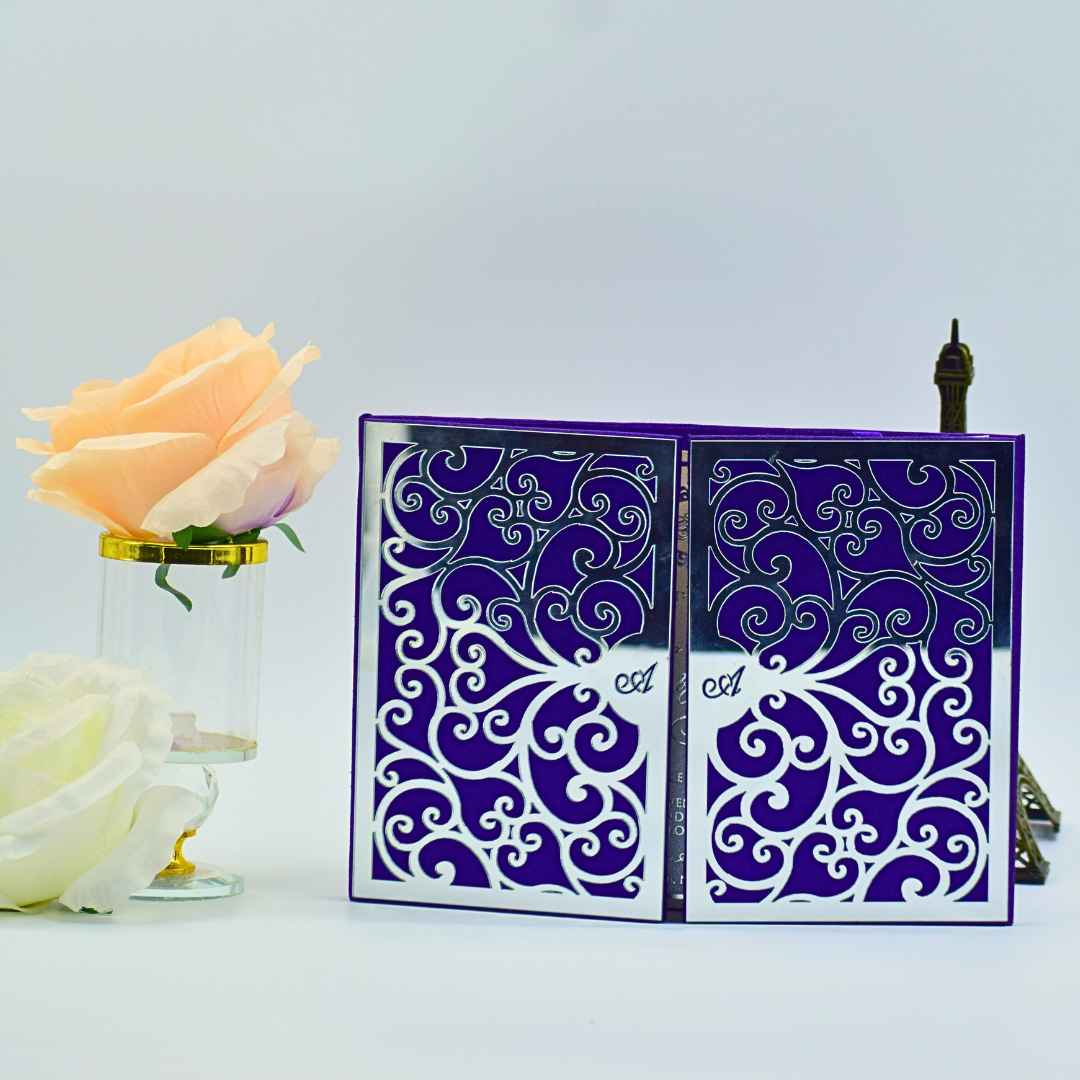 Each detail— from the deep purple hue symbolizing passion and royalty to the high-gloss mirror finish—is crafted to perfection. Whether you’re hosting a grand ballroom wedding or a modern luxury celebration, this invitation sets the tone for elegance, class, and unforgettable moments.