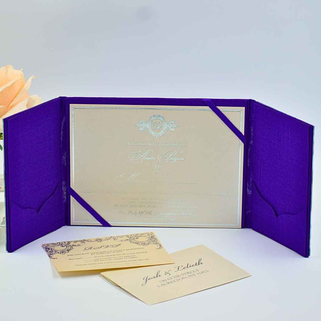 Step into a world of luxury with our Royal Purple Mirror Acrylic Gate-Fold Wedding Invitation Folio, a stunning blend of elegance and innovation. Designed for couples who desire something extraordinary, this invitation transforms every first impression into a lasting memory.