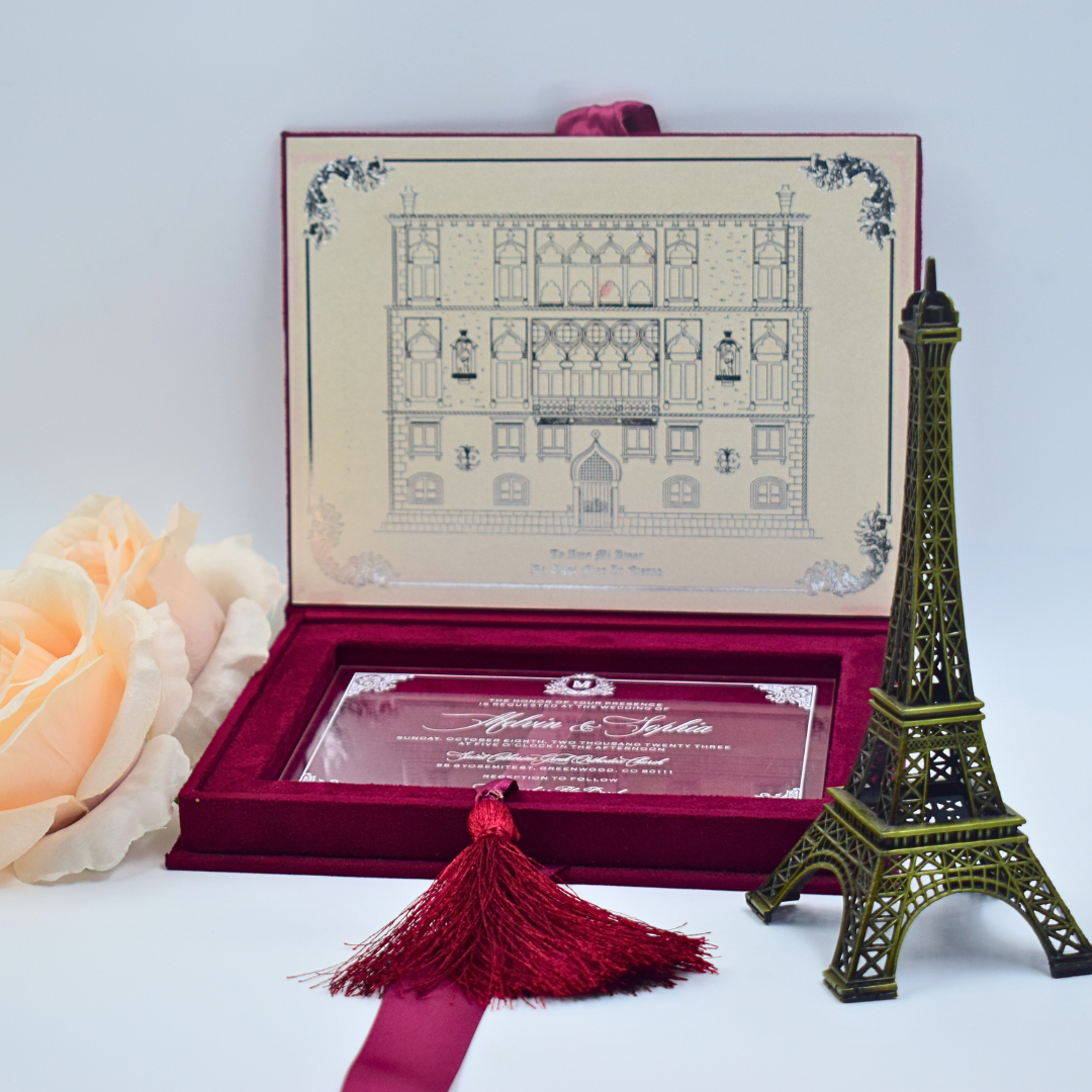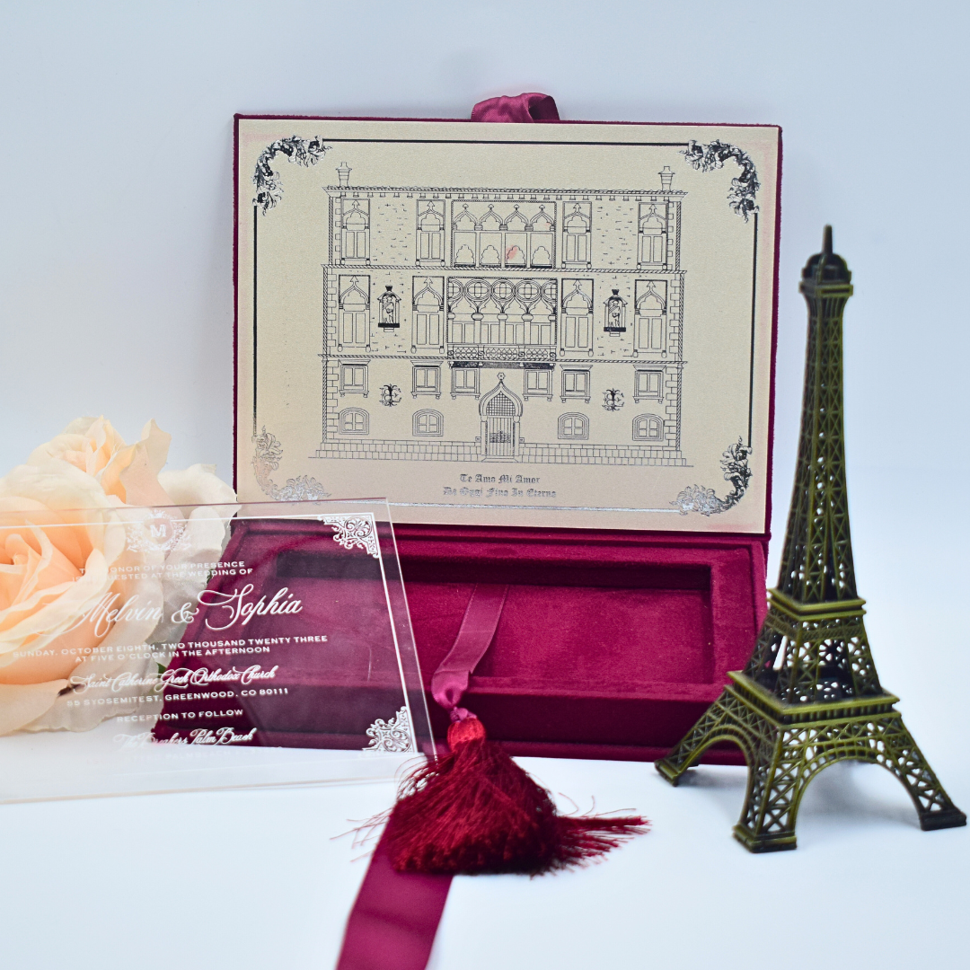 𝕋ℍ𝕀𝕊 𝕃𝕀𝕊𝕋𝕀ℕ𝔾 𝕀ℕℂ𝕃𝕌𝔻𝔼𝕊: Suede invitation box adorned with a custom foiled monogram for a touch of exclusivity. An elegant acrylic invitation that blends traditional sophistication with contemporary chic and a mailing envelope.
