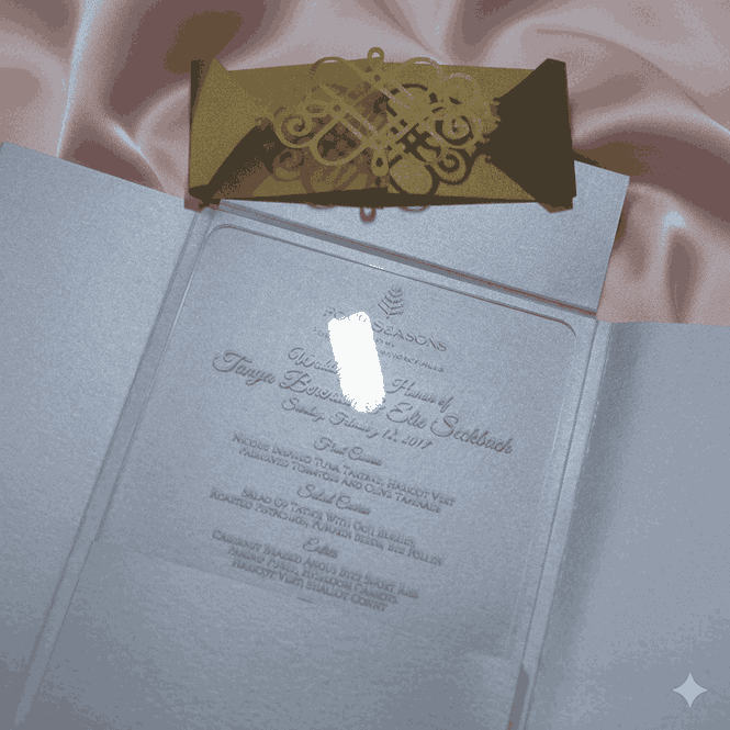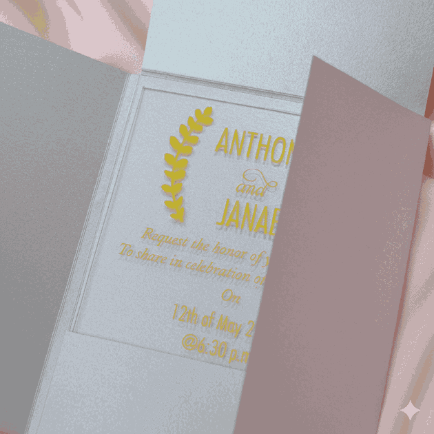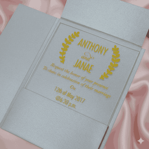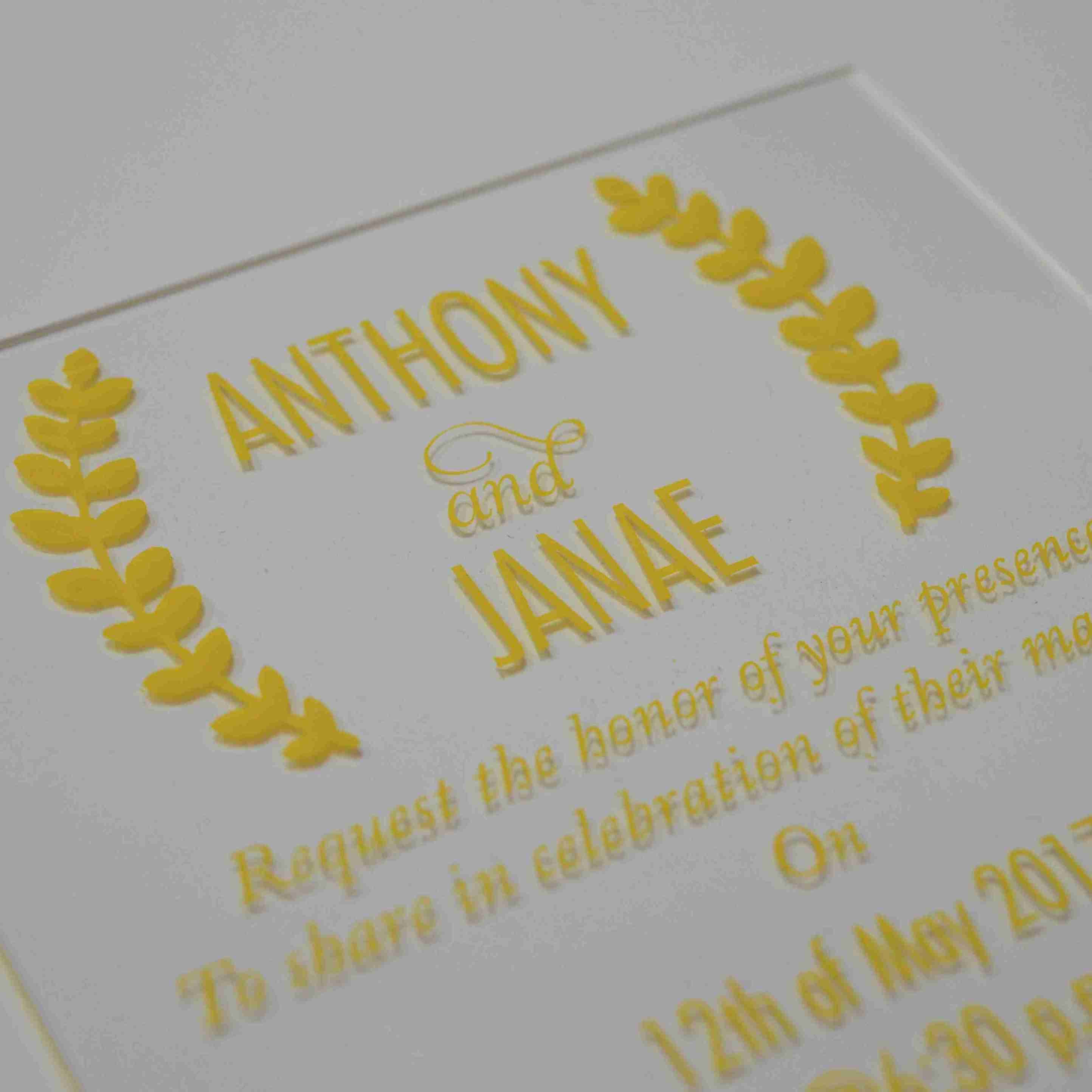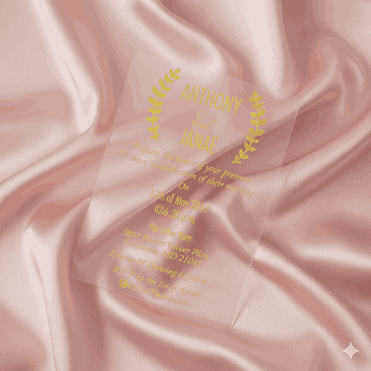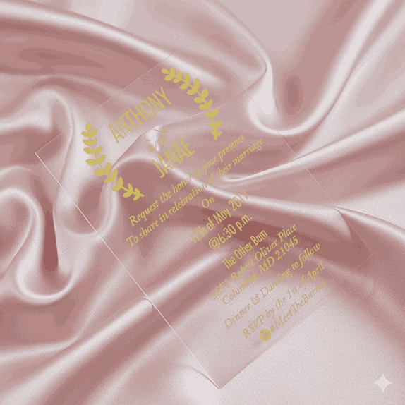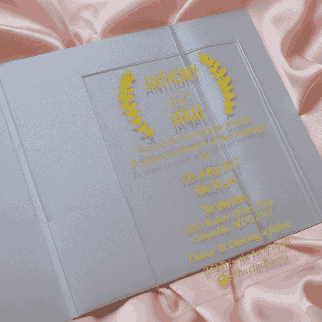 𝕋ℍ𝕀𝕊 𝕃𝕀𝕊𝕋𝕀ℕ𝔾 𝕀ℕℂ𝕃𝕌𝔻𝔼𝕊: A minimalist clear acrylic wedding invitation with silk-screen printed details. The acrylic invitation comes with a mailing envelope and a bellyband to wrap around it. This invitation can be totally customized.