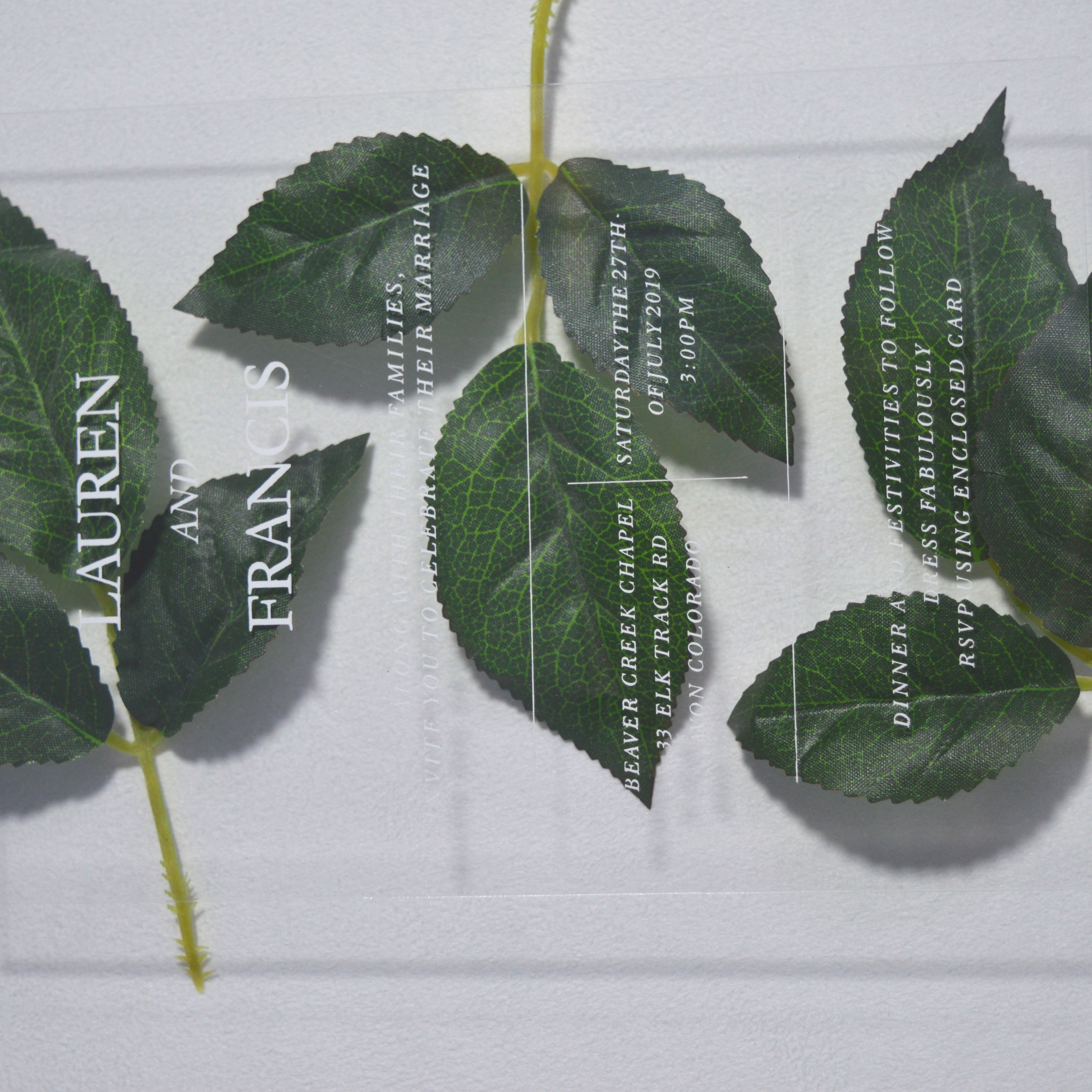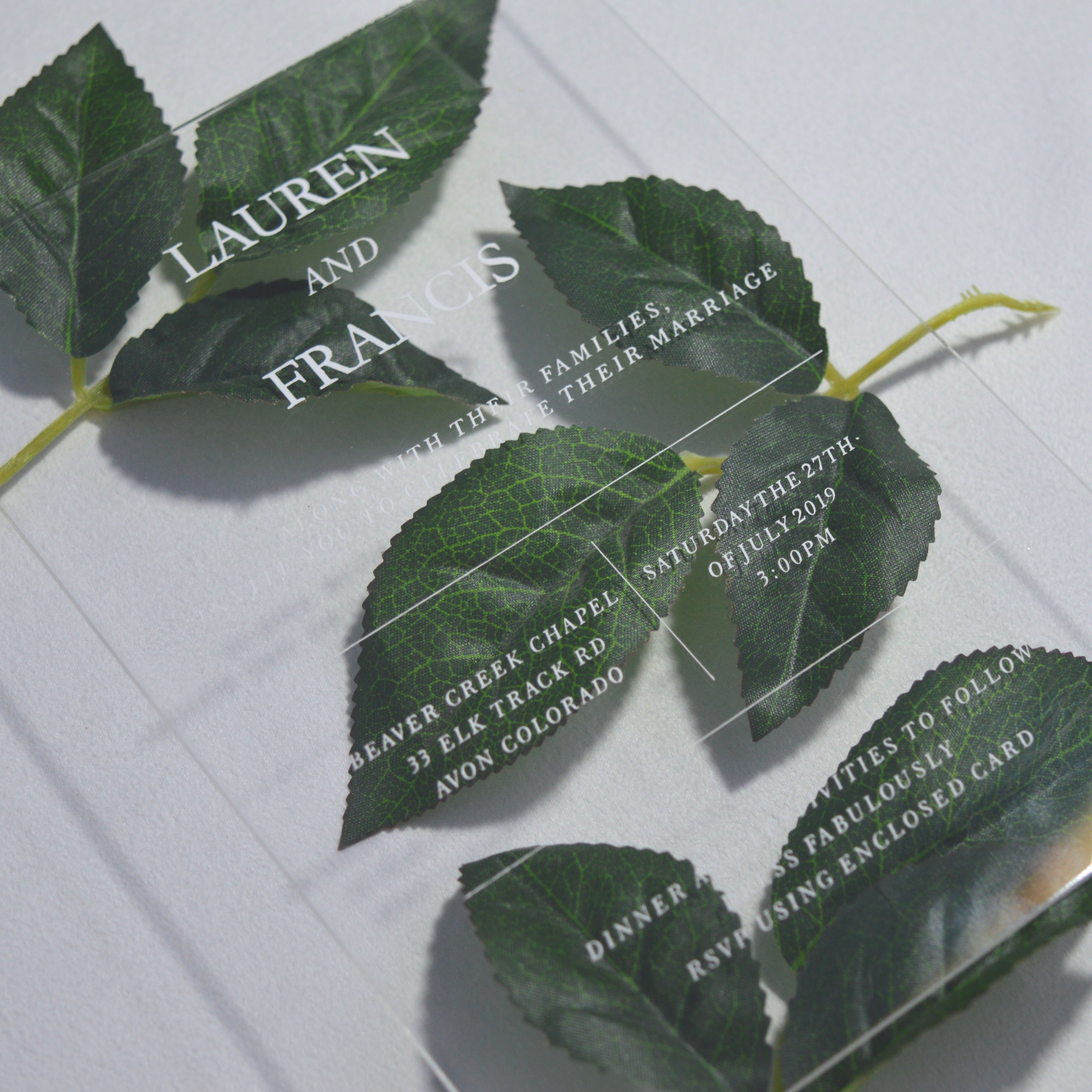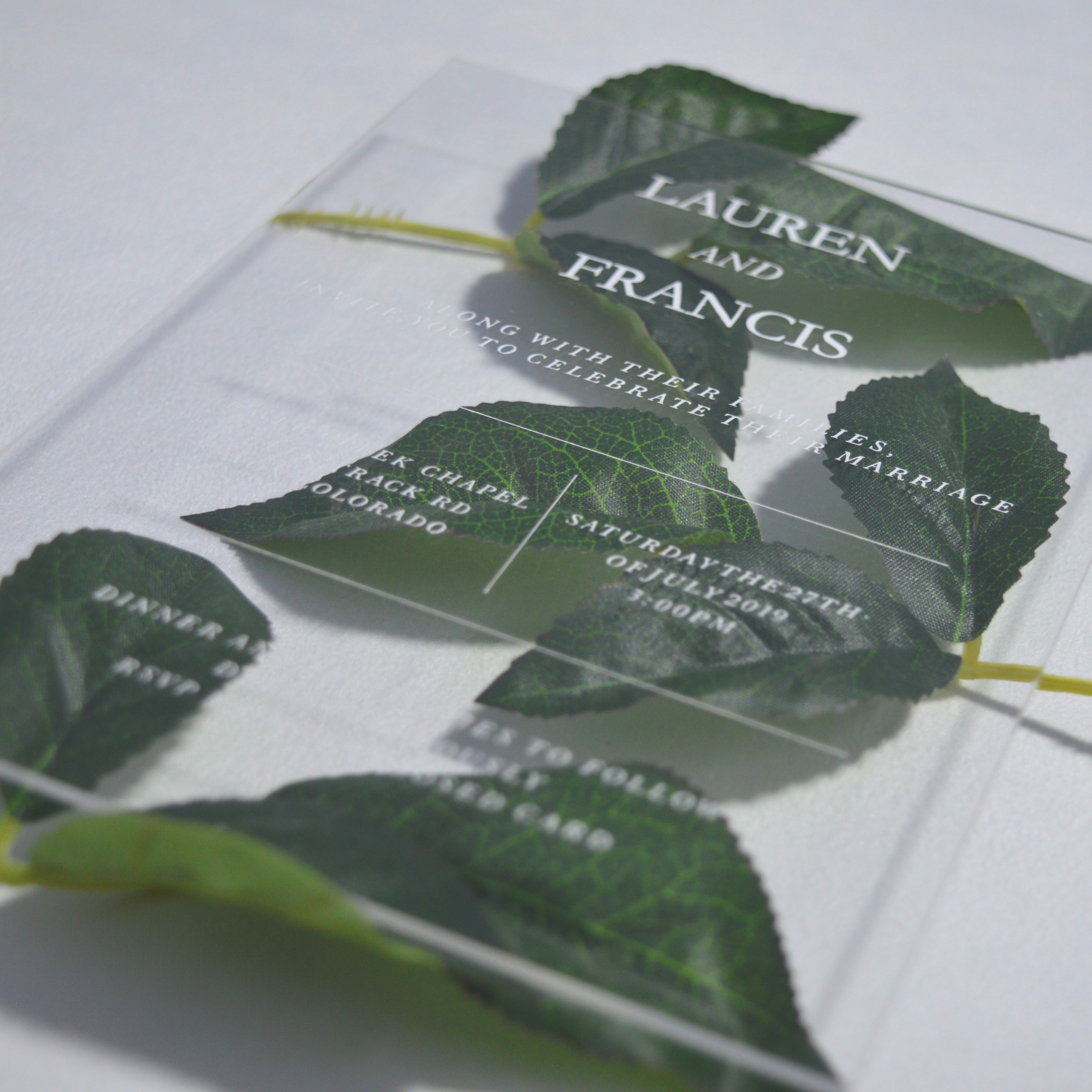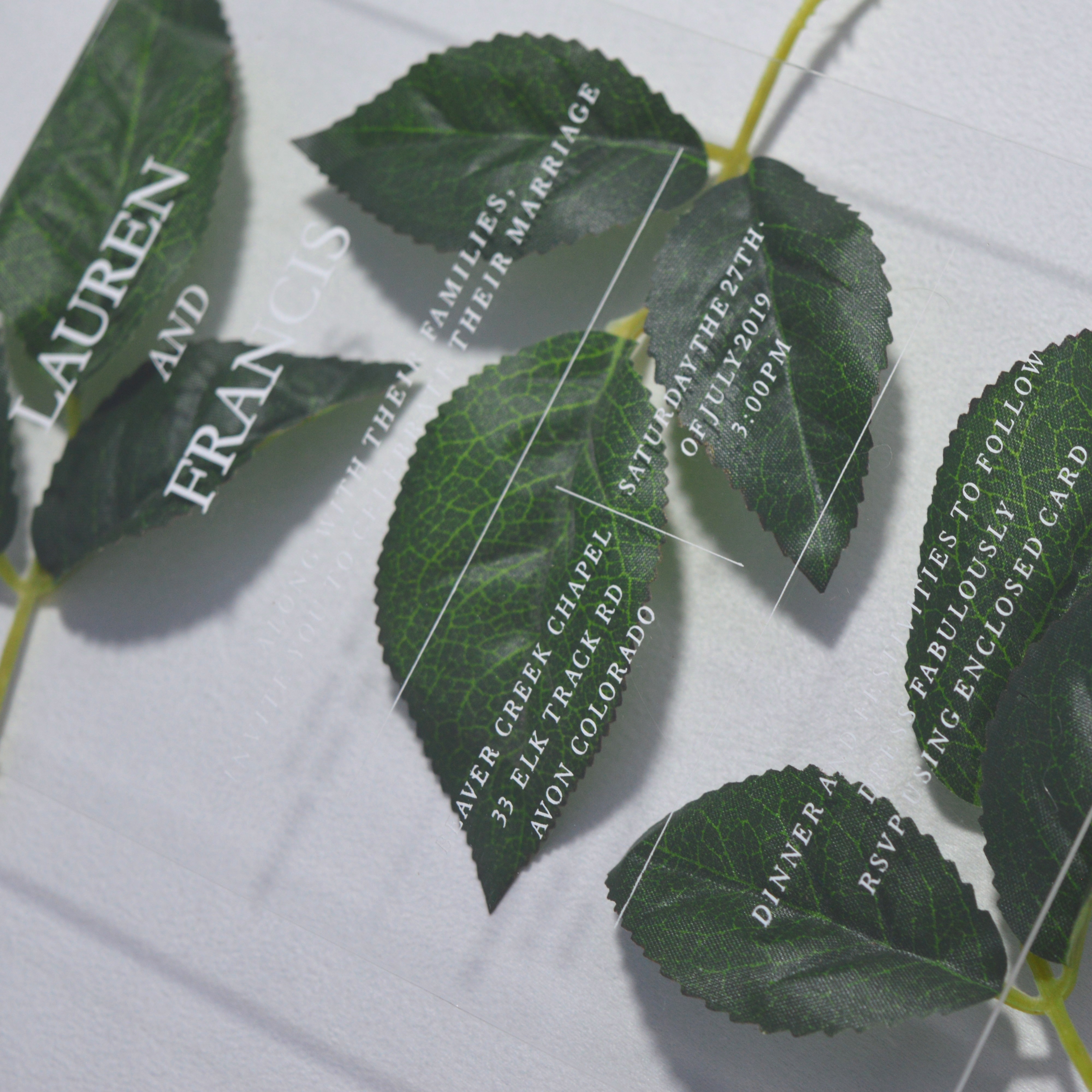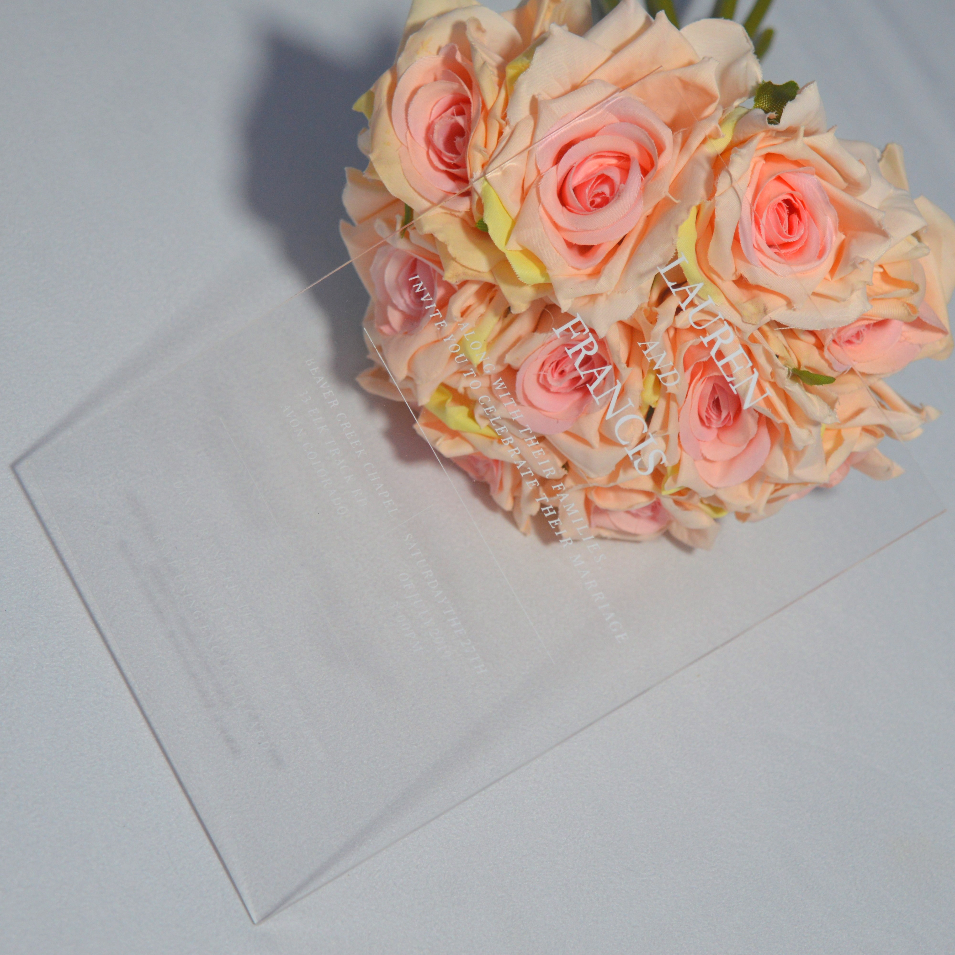 πβππ πππππβπΎ πββπππ»πΌπ: A clear acrylic wedding invitation with minimalist theme. The details over the clear acrylic are silk screen printed. This acrylic invitation comes with a mailing envelope.