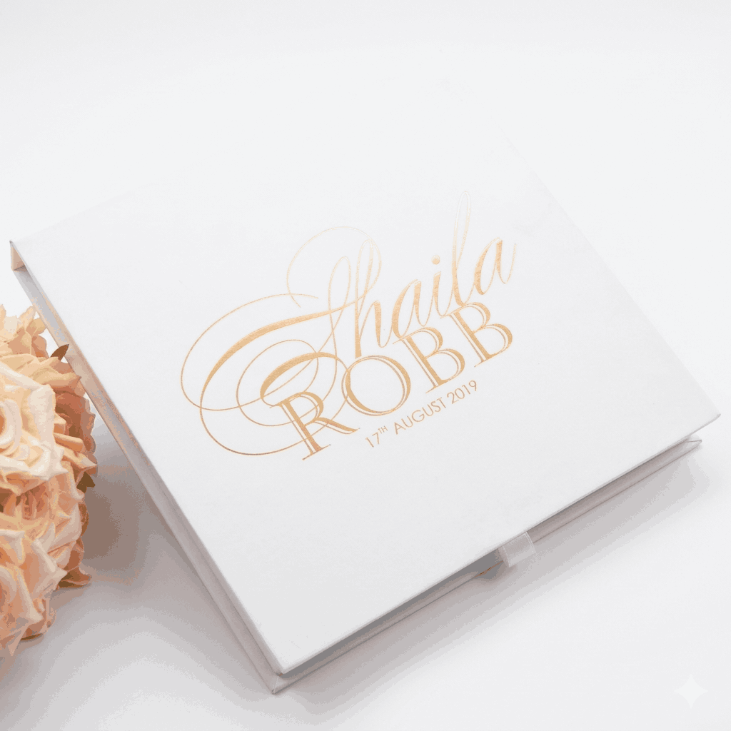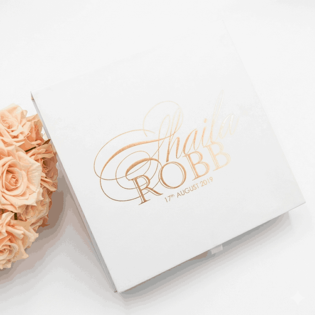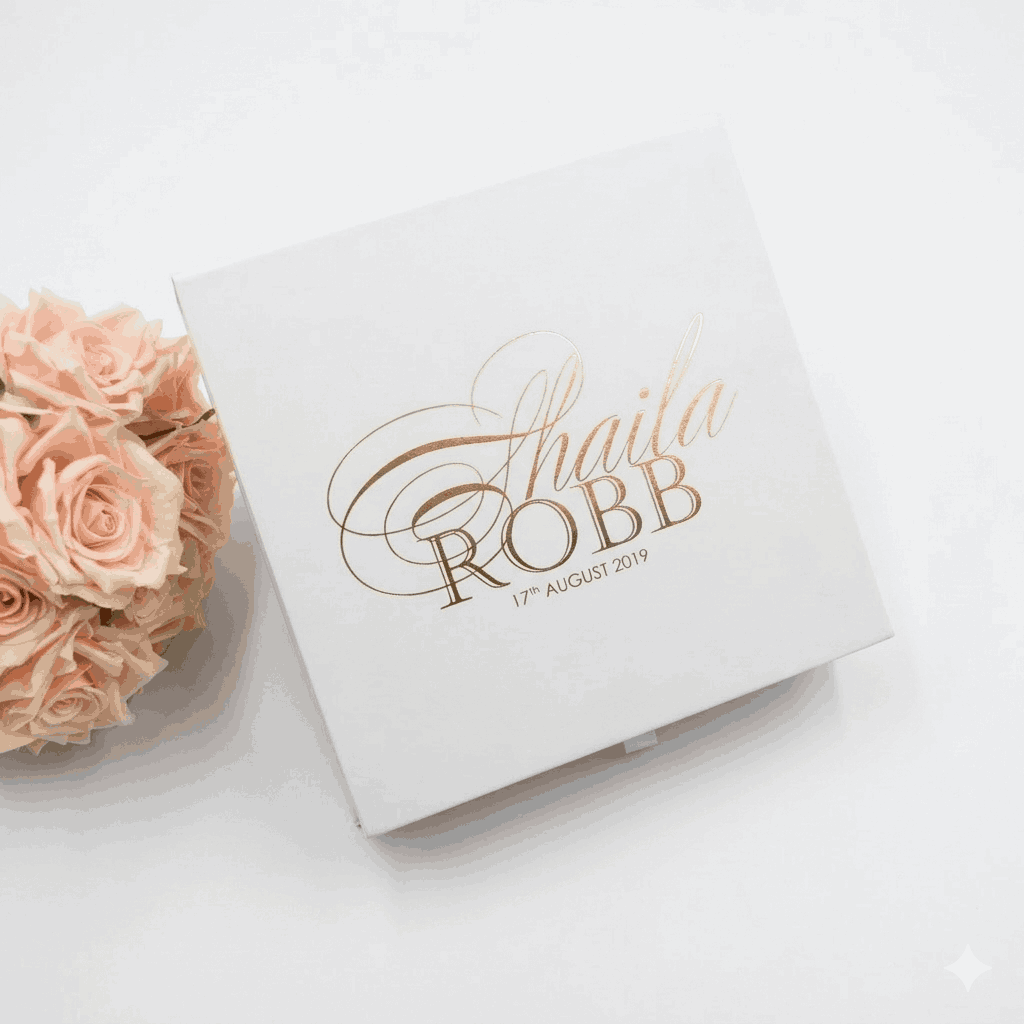 𝕋ℍ𝕀𝕊 𝕃𝕀𝕊𝕋𝕀ℕ𝔾 𝕀ℕℂ𝕃𝕌𝔻𝔼𝕊: A wedding invitation box with a custom foil monogram and an acrylic invitation with silk screen printed details. The boxed invite has a pocket inside the lid for additional enclosure card inserts.