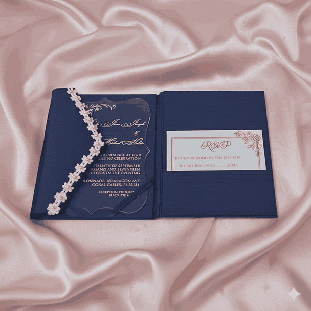 πβππ πππππβπΎ πββπππ»πΌπ: A wedding invitation folio with a tri-fold orientation. This silk folio comes with a die-cut shape acrylic invitation. The silk wedding invite has a pocket inside for additional enclosure card inserts.