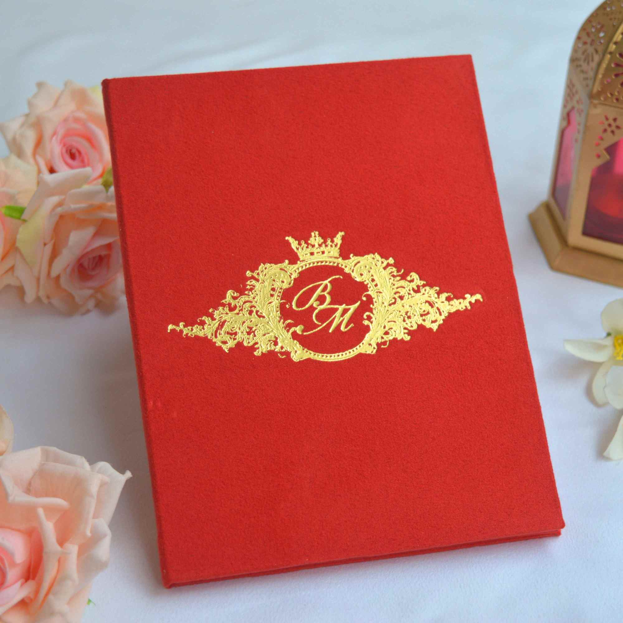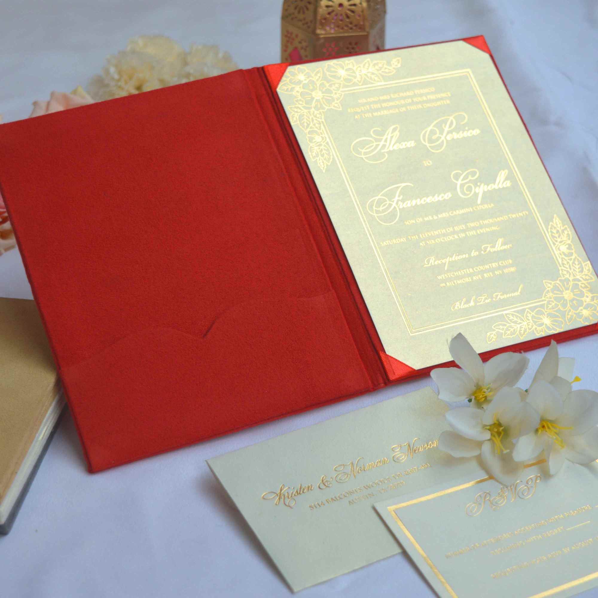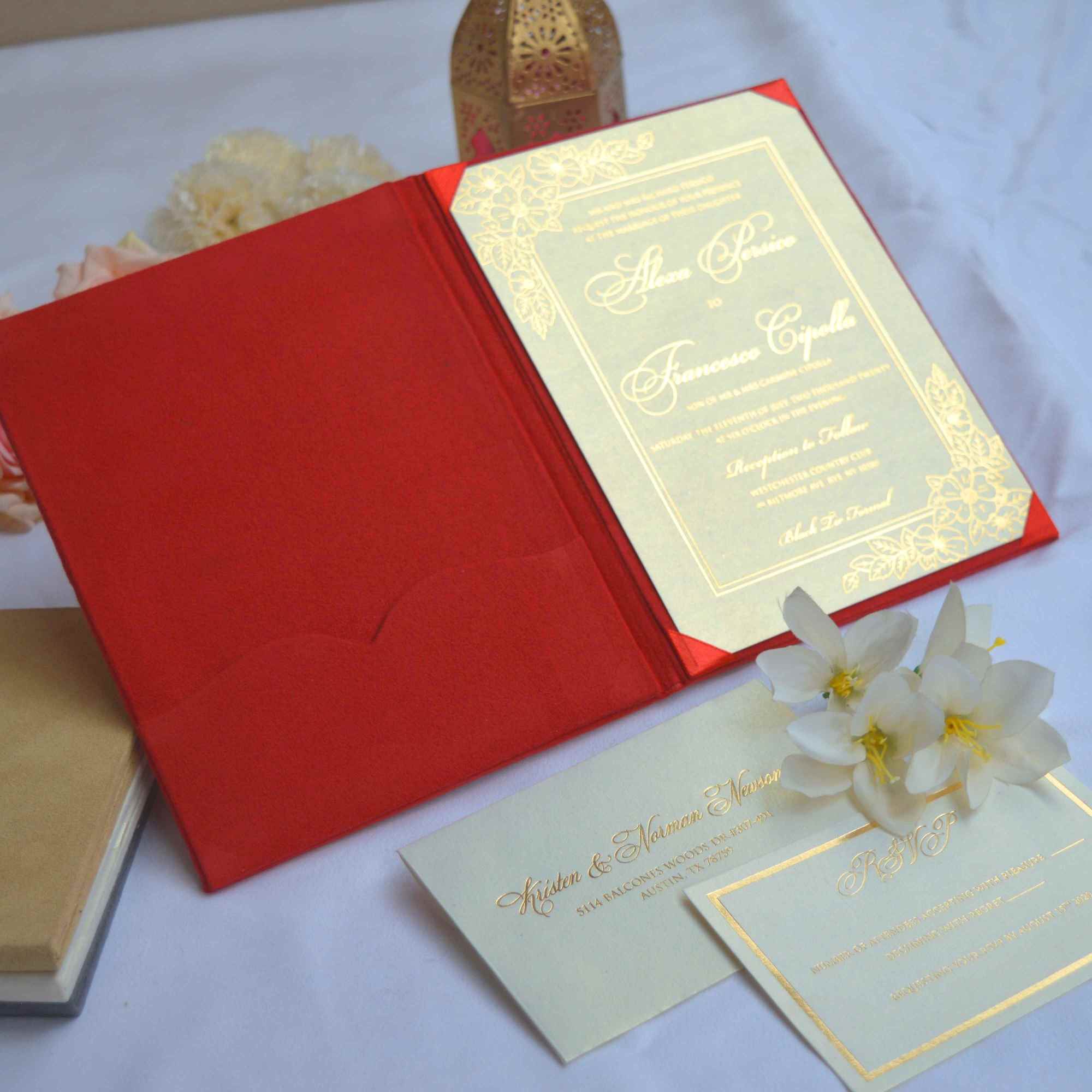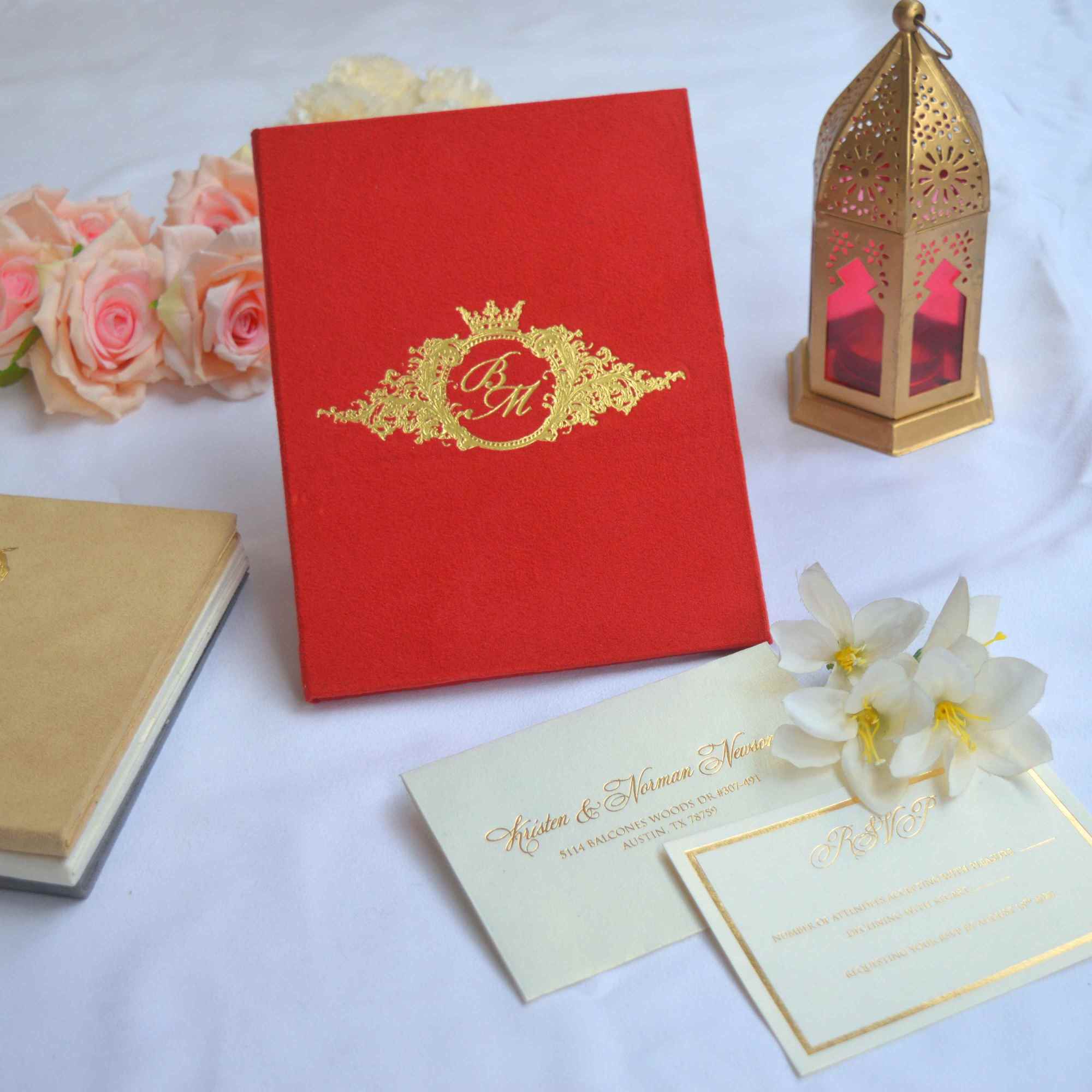 πβππ πππππβπΎ πββπππ»πΌπ: A bi-fold velvet wedding invitaion folio with a hot foil monogram. The velvet folio has a pearl shimmery cardstock invitation insert card with foil print in the center and a pocket for additional enclosure insert cards.