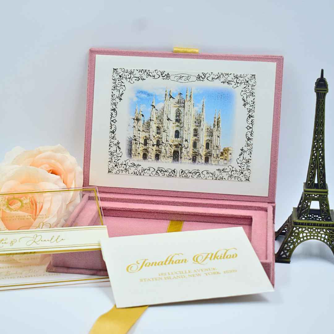 𝕋ℍ𝕀𝕊 𝕃𝕀𝕊𝕋𝕀ℕ𝔾 𝕀ℕℂ𝕃𝕌𝔻𝔼𝕊: A premium velvet wedding invitation box, adorned with a gold foil monogram and a picturesque depiction of your venue on the flap, sets a lavish first impression.