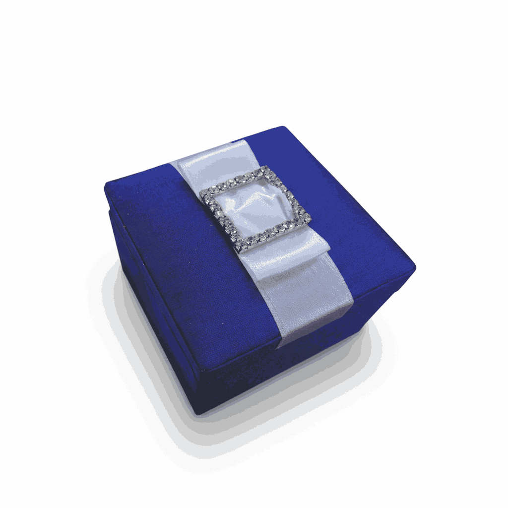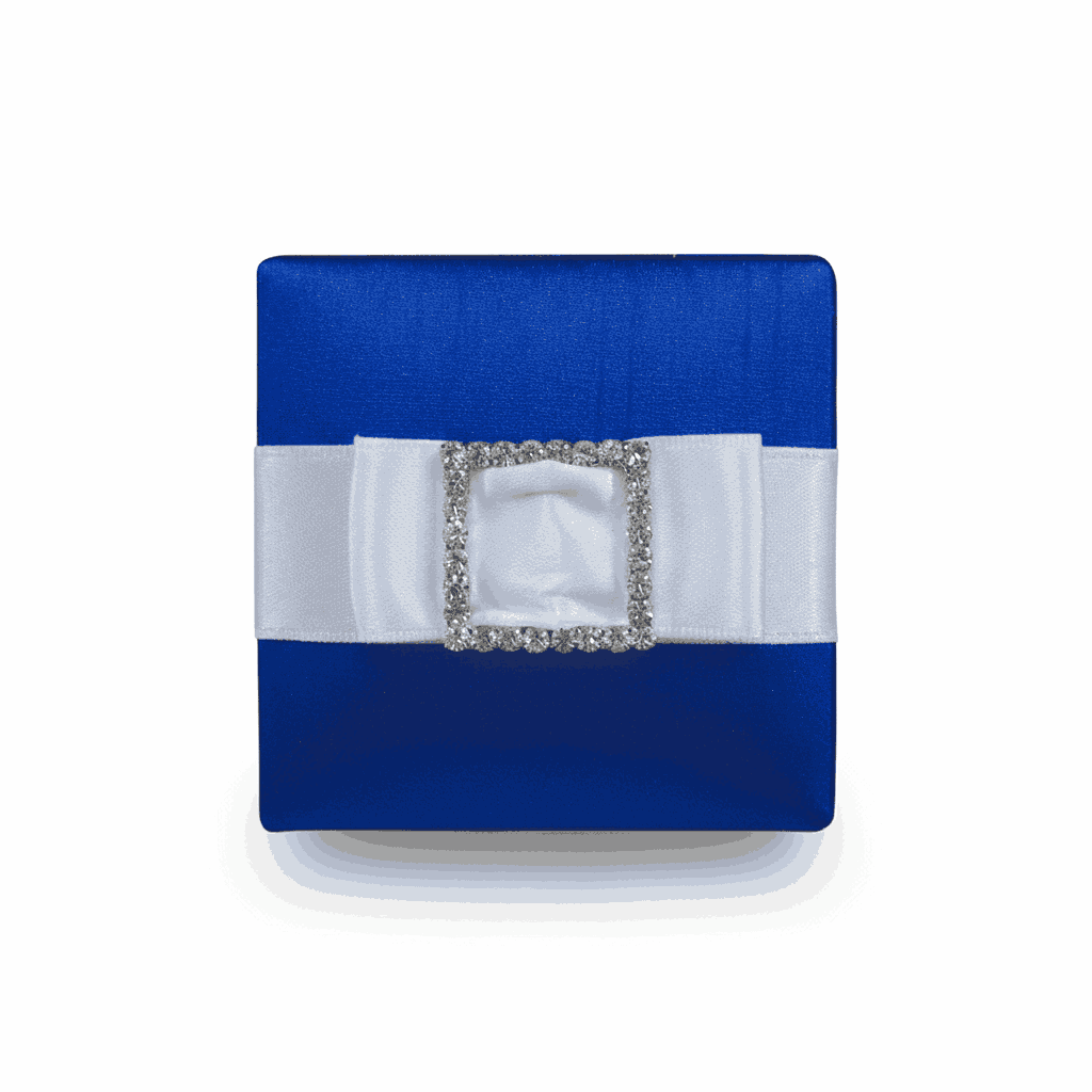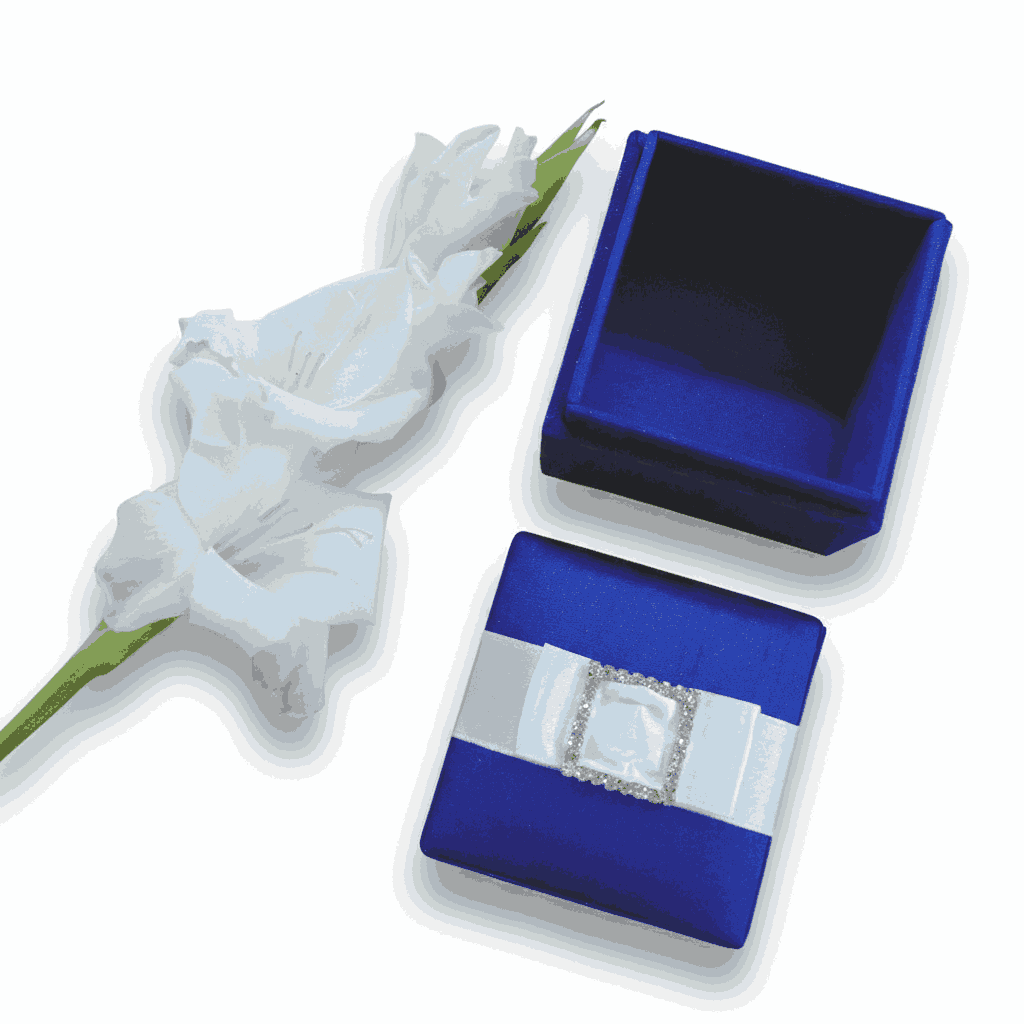 A beautiful silk wedding favor box with a removable lid adorned with a satin ribbon and crystal rhinestones embellishment.