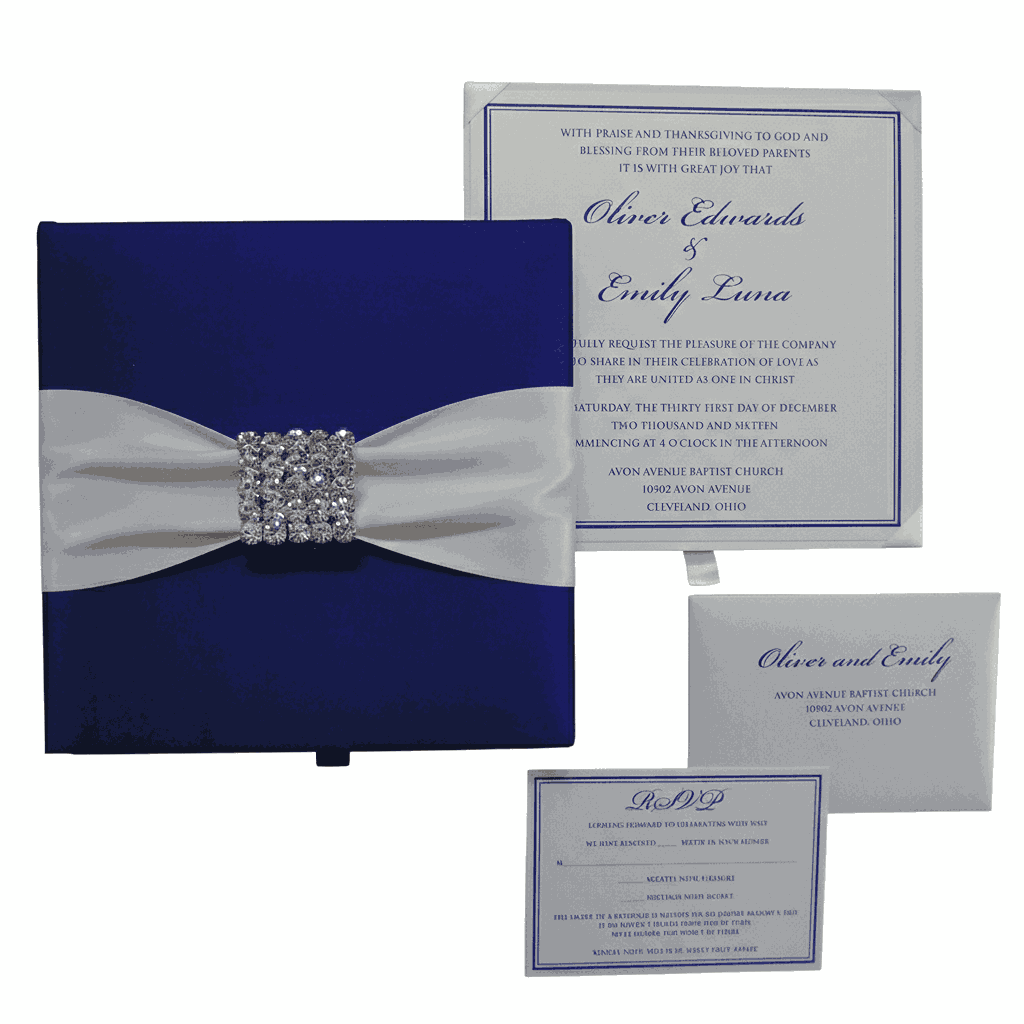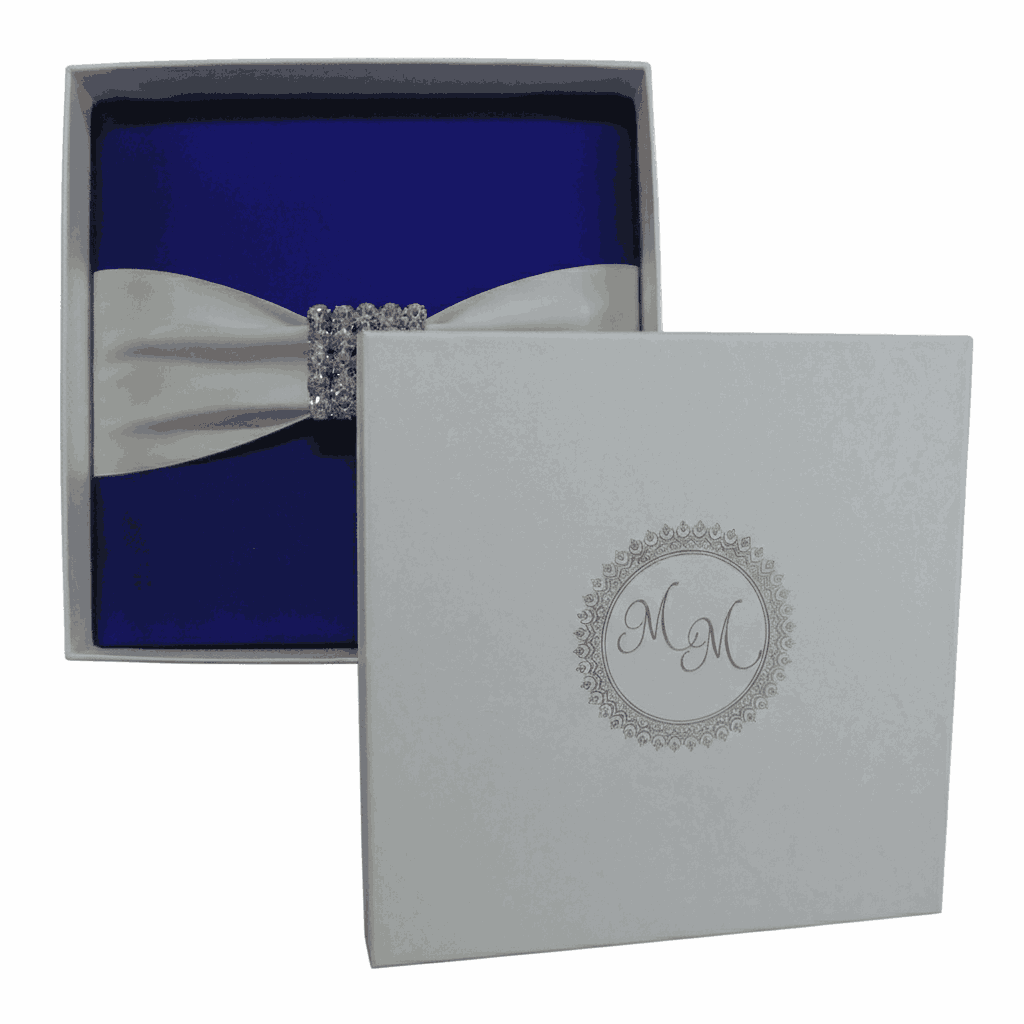 πβππ πππππβπΎ πββπππ»πΌπ: A silk wedding invitation box with a hinged lid and a double trim satin ribbon with a crystal rhinestones brooch. This boxed invitation comes with a silk cardholder that carries a pearl shimmery cardstock invitation insert with foil details