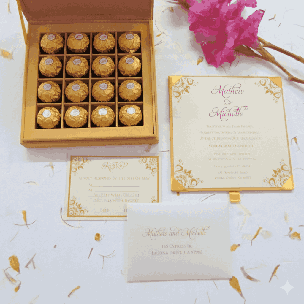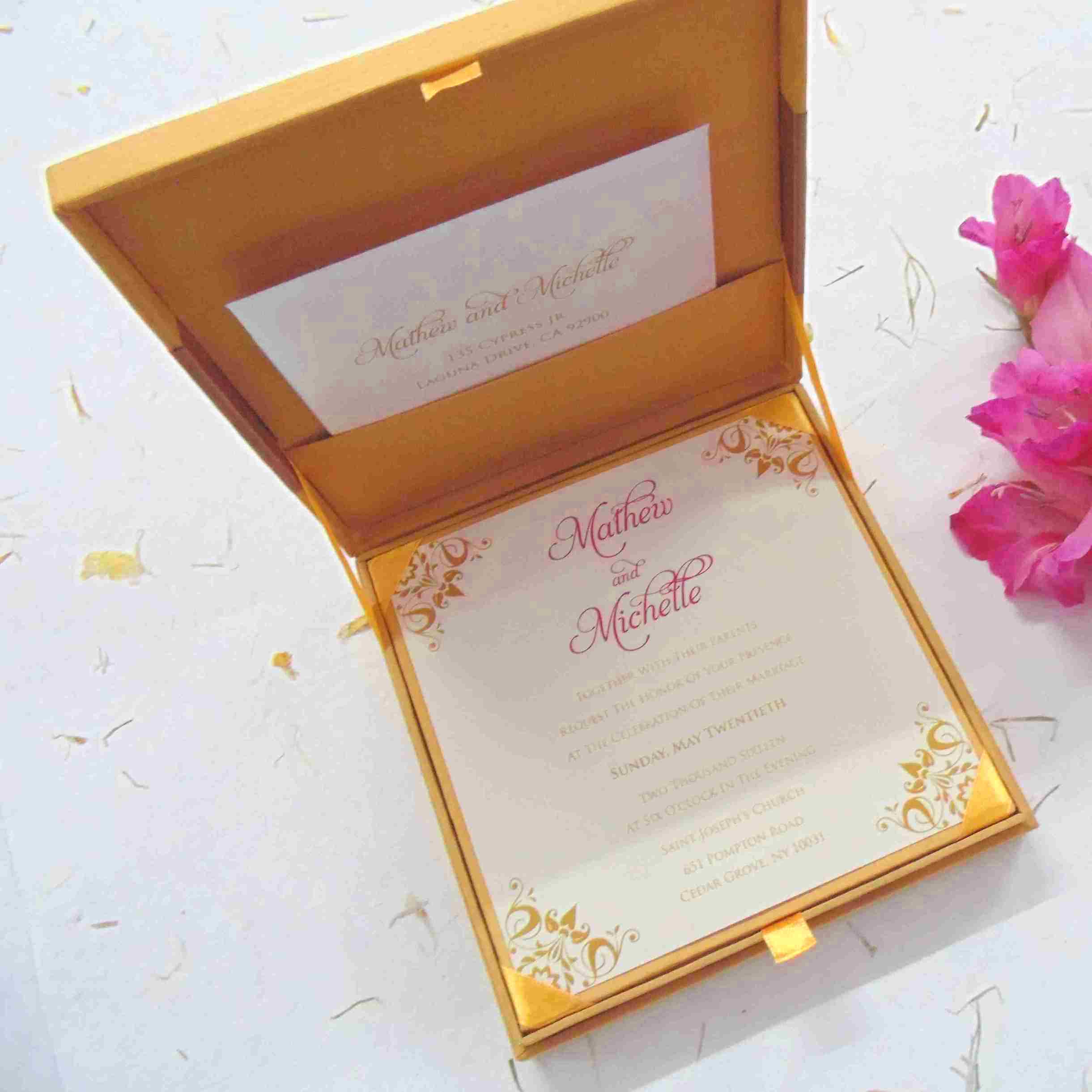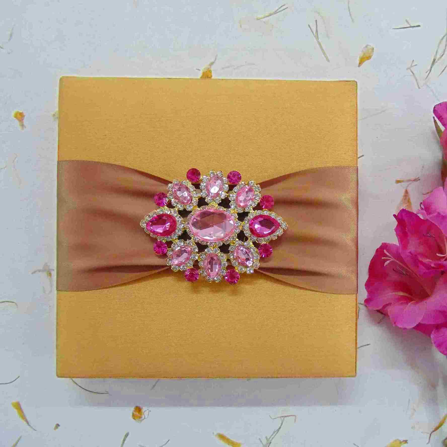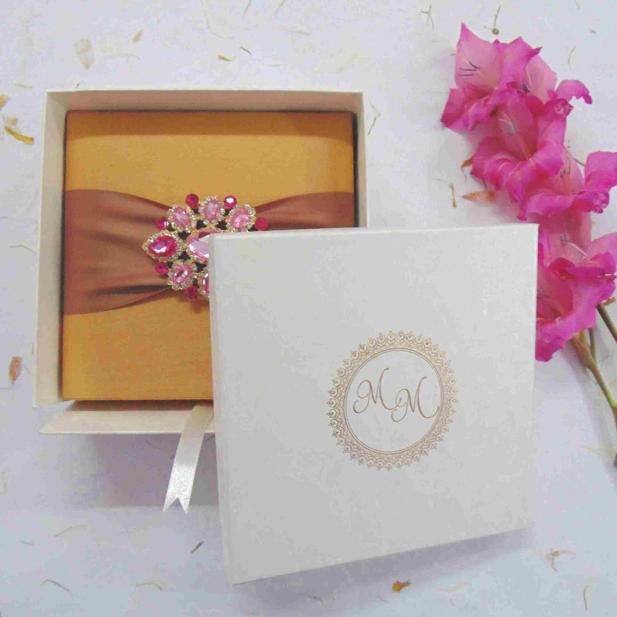 πβππ πππππβπΎ πββπππ»πΌπ: A silk wedding invitation box with a chocolate tray. This boxed invitation has a hinged lid adorned with a double trim satin ribbon and crystal rhinestones brooch. Inside this luxury box is a silk cardholder with a perl shimmery cardstock invitation insert printed with hot foiled details. Beneath the silk cardholder is the tray for chocolates and candies. There is a pocket inside the lid of the box for additional enclosure card inserts.