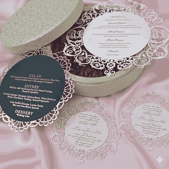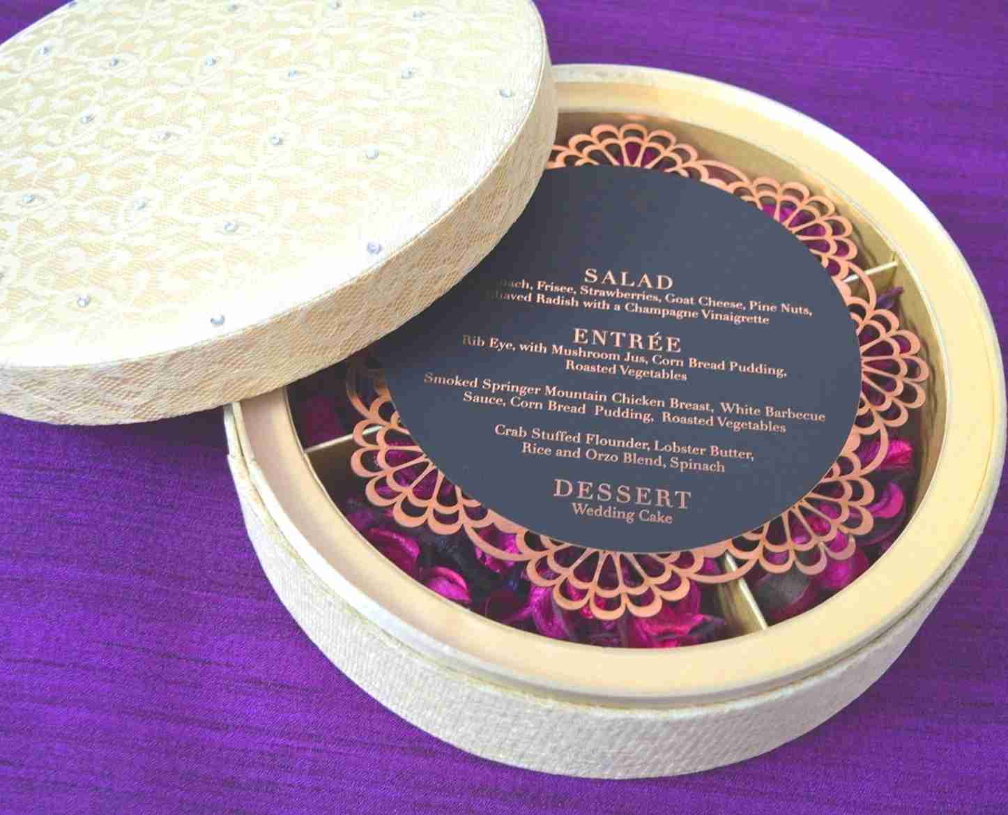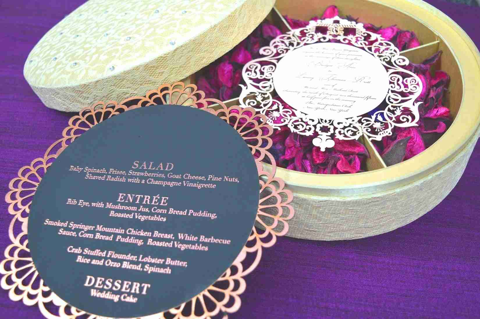 πβππ πππππβπΎ πββπππ»πΌπ: A silk wedding invitation box with embroidery lace and rhinestone, the box has a removable lid and come with a chocolate tray. A pearl shimmery cardstock invitation with foiled and laser-cut details is included.