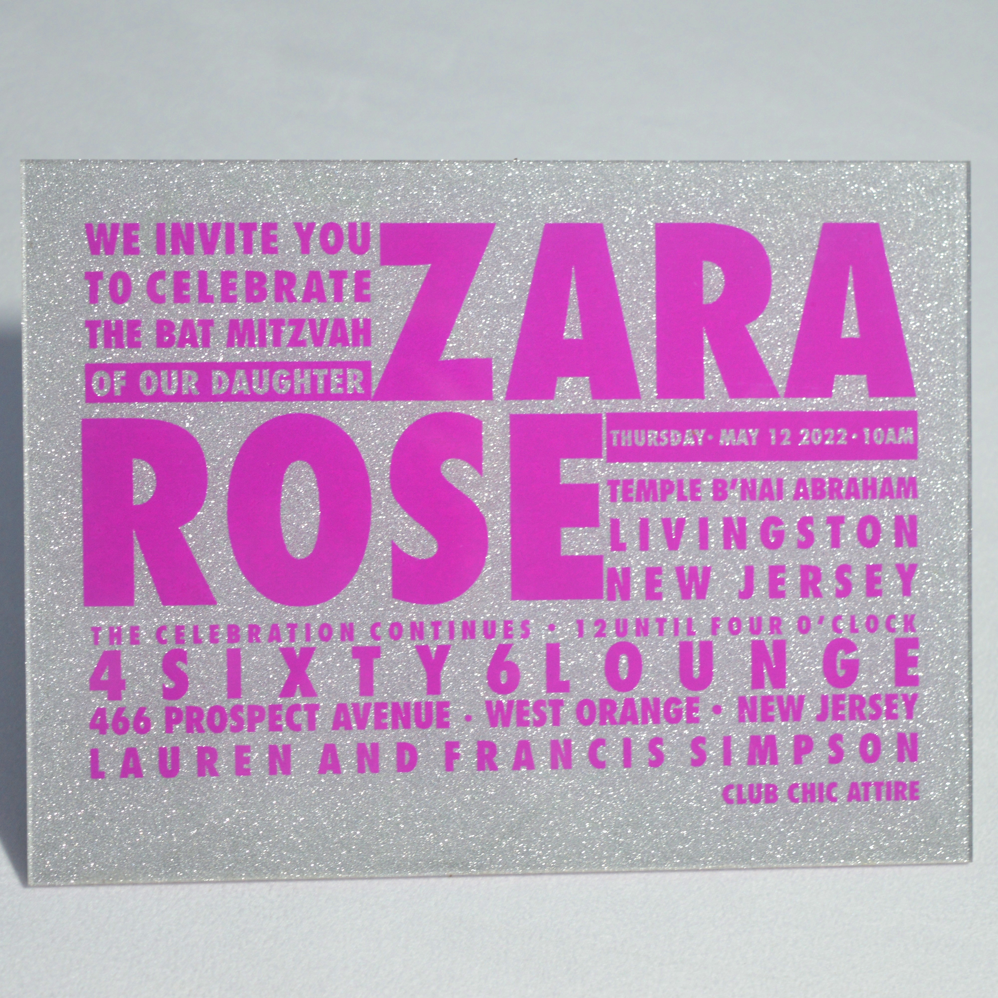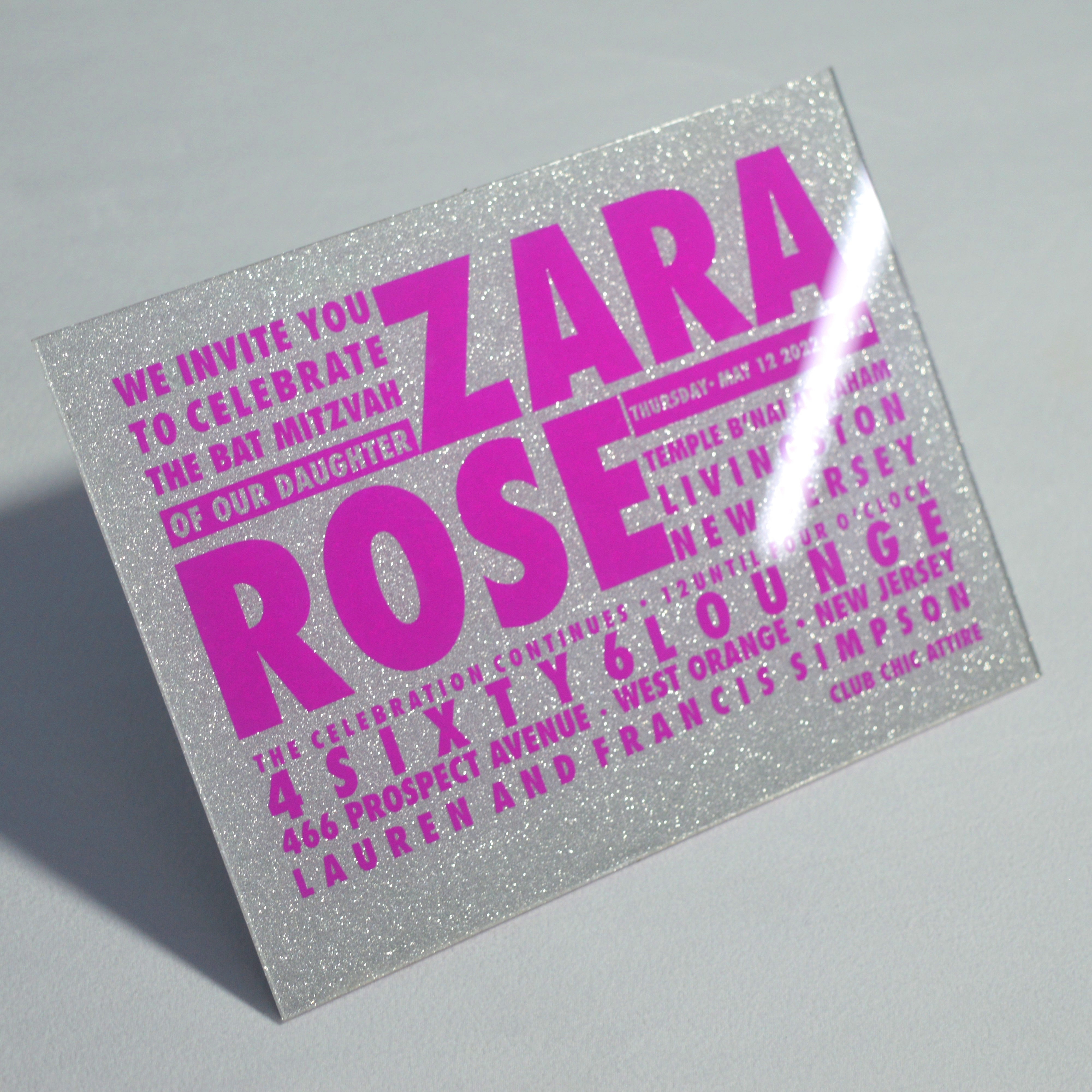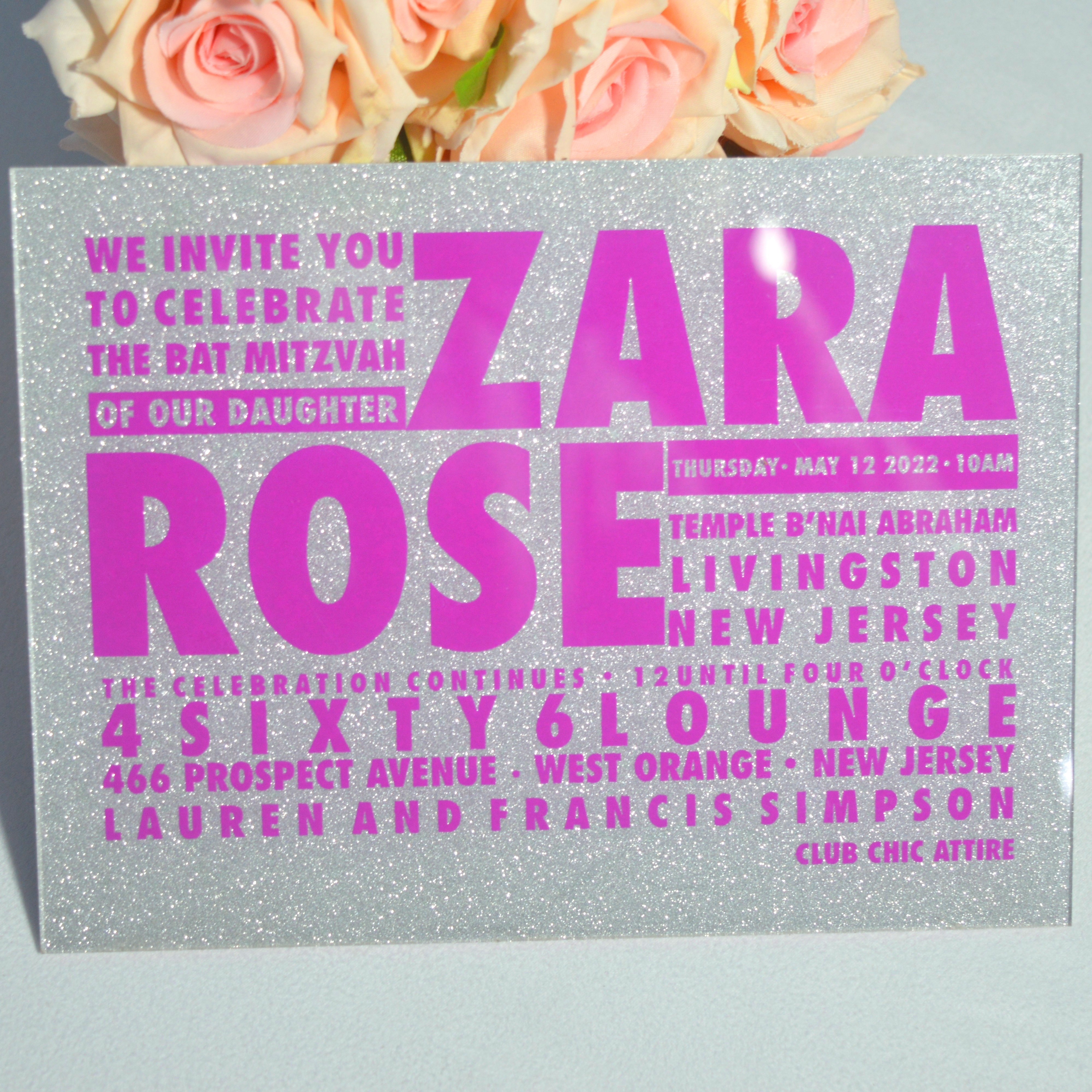πβππ πππππβπΎ πββπππ»πΌπ: A silver glitter acrylic Bat Mitzvah invitation with silk screen printed details. This acrylic invitation comes with a mailing envelope.