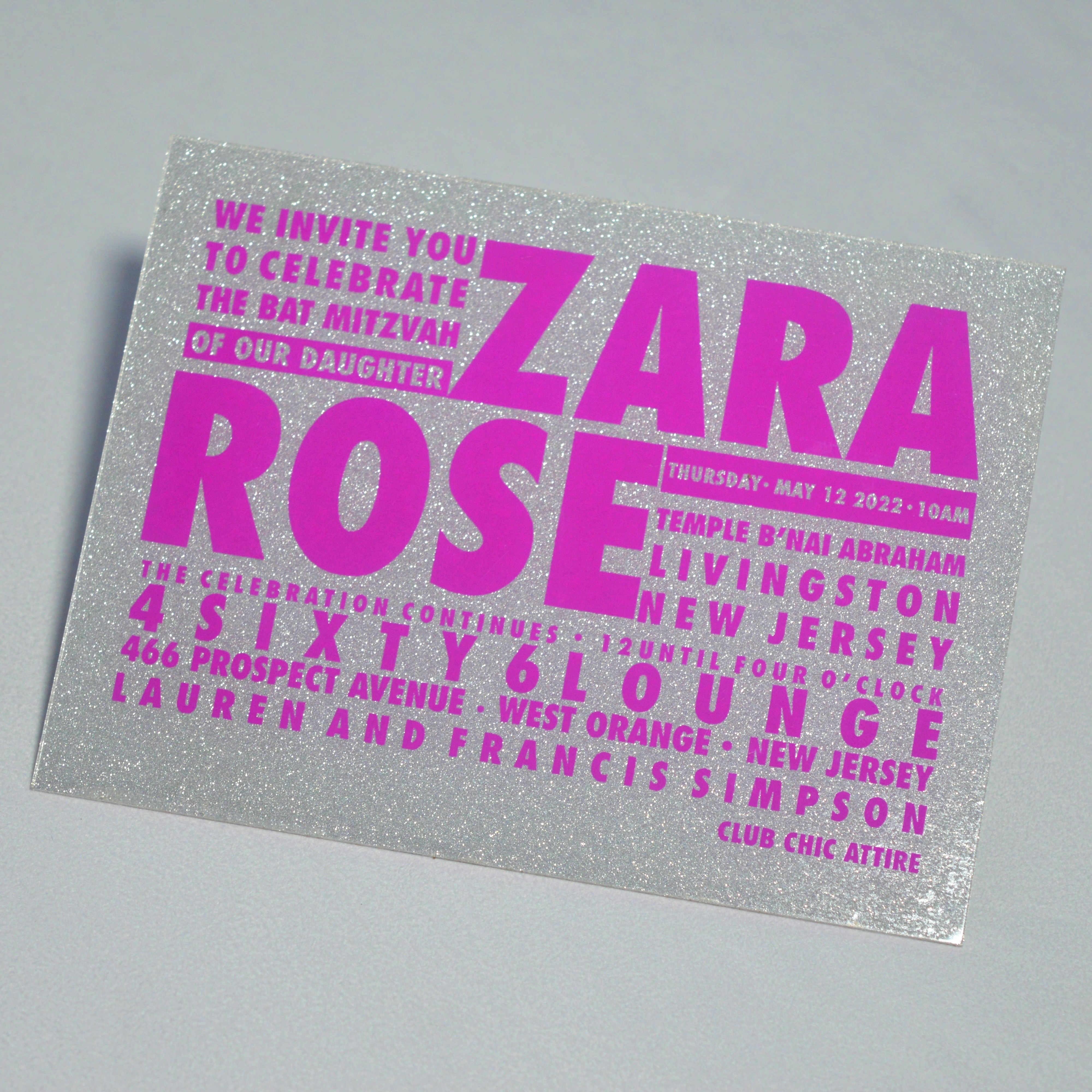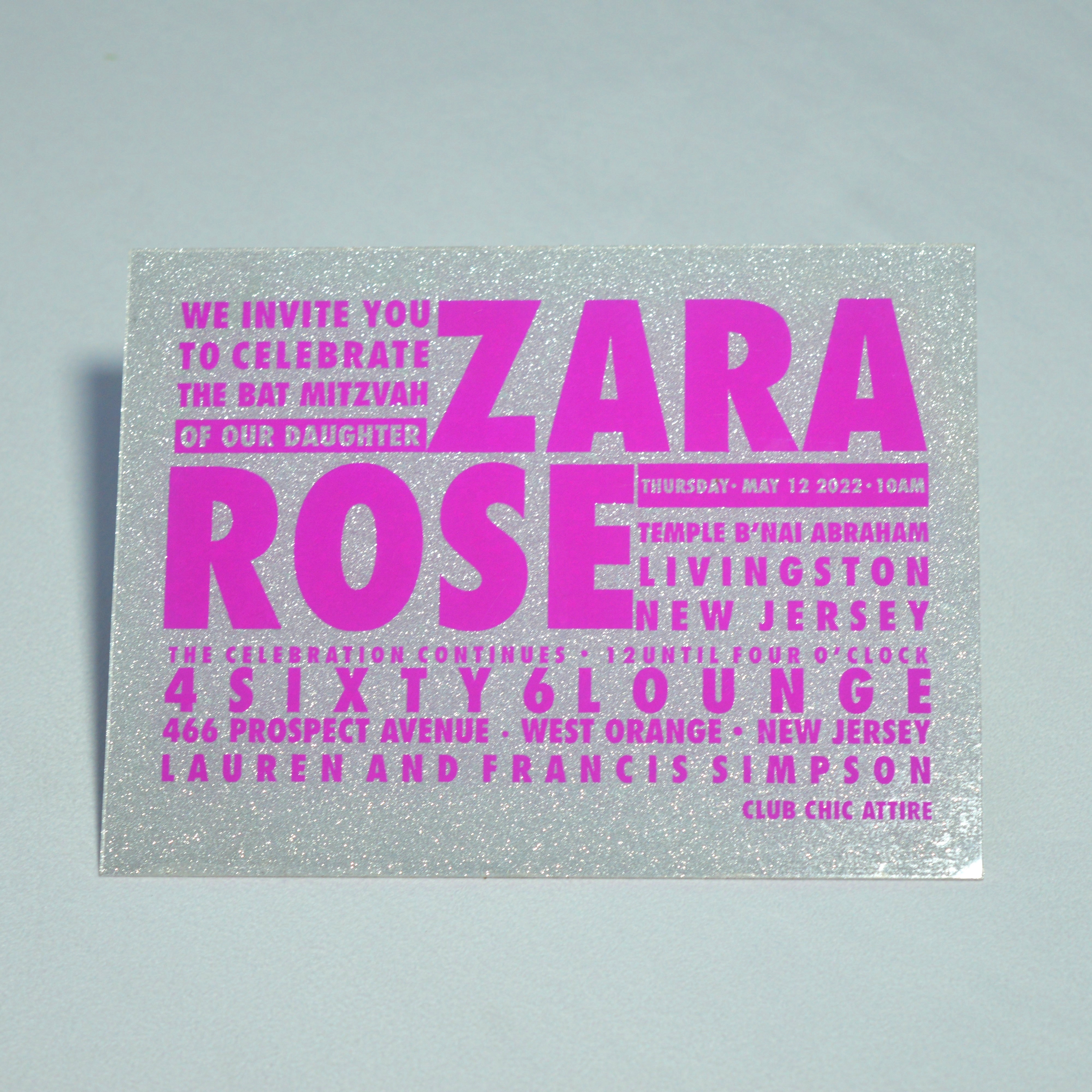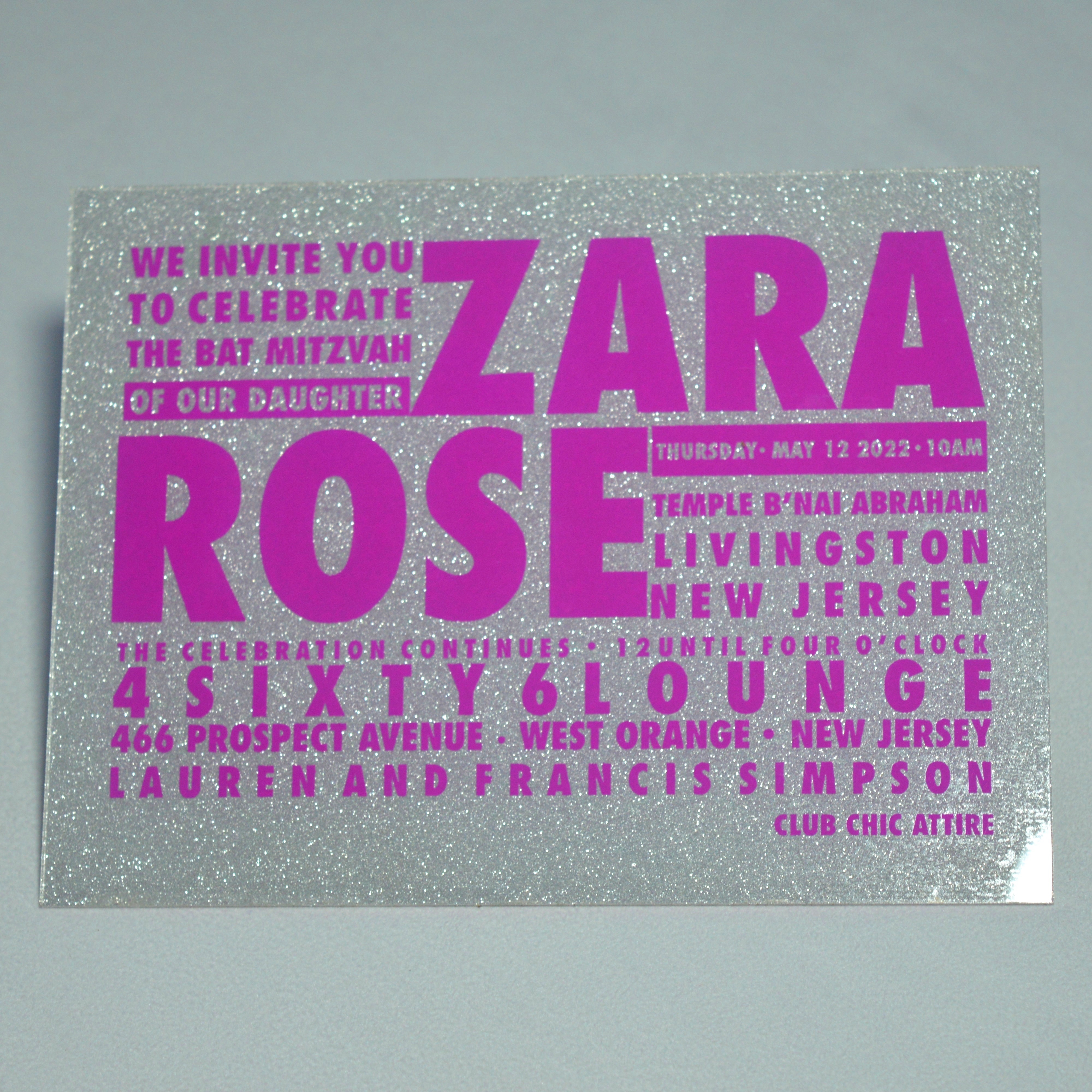 πβππ πππππβπΎ πββπππ»πΌπ: A silver glitter acrylic Bat Mitzvah invitation with silk screen printed details. This acrylic invitation comes with a mailing envelope.