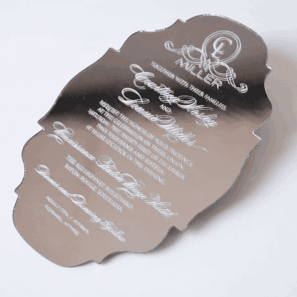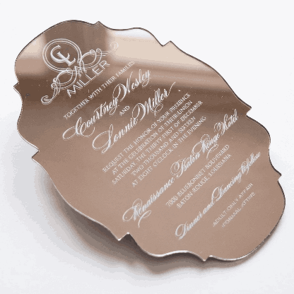 πβππ πππππβπΎ πββπππ»πΌπ: A mirror acrylic invitation with laser-cut design and silk screen printed details. This mirrored acrylic invitation comes with a mailing envelope.