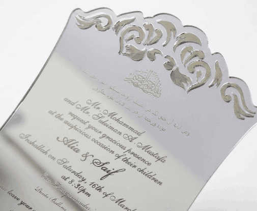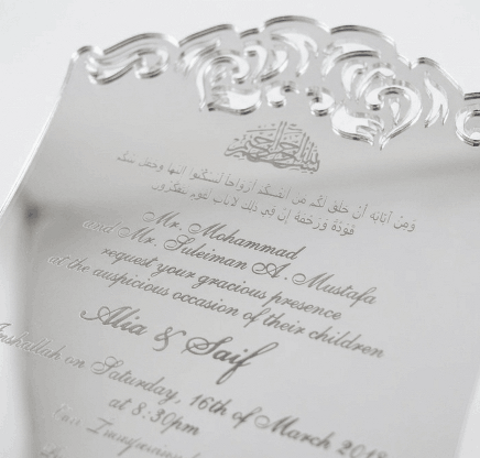 πβππ πππππβπΎ πββπππ»πΌπ: A mirror acrylic wedding invitation with laser-cut artwork and engraved verbiage details. This acrylic invitation comes with a cardstock mailing envelope.