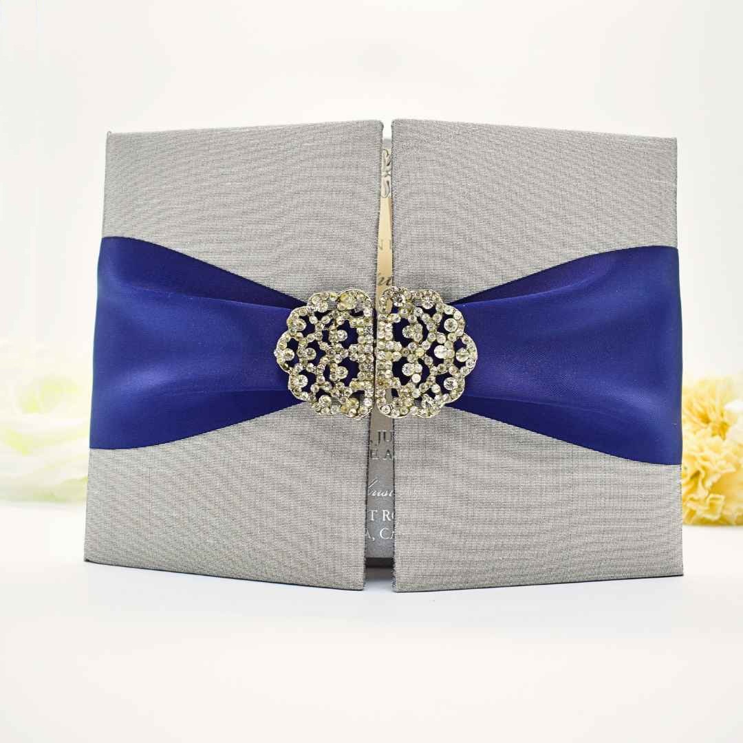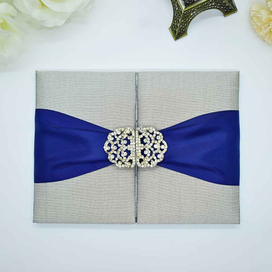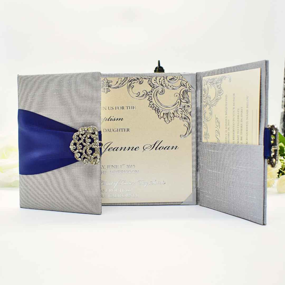 Silver Silk Wedding Invitation Folio with Navy Blue Ribbon & Crystal Brooch