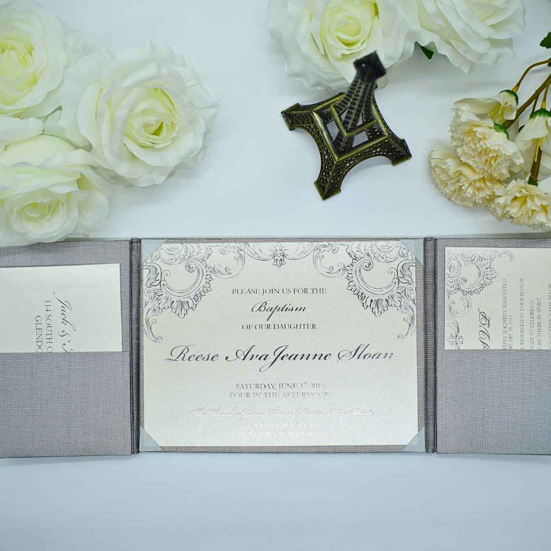 𝕋ℍ𝕀𝕊 𝕃𝕀𝕊𝕋𝕀ℕ𝔾 𝕀ℕℂ𝕃𝕌𝔻𝔼𝕊: A gate-fold silk wedding invitation folio with a double trim satin ribbon and crystal rhinestone buckle brooch. The silk folio has a foil printed, pearl shimmery invitation insert card in the center and there are pockets inside both the gates for additional enclosure cards.