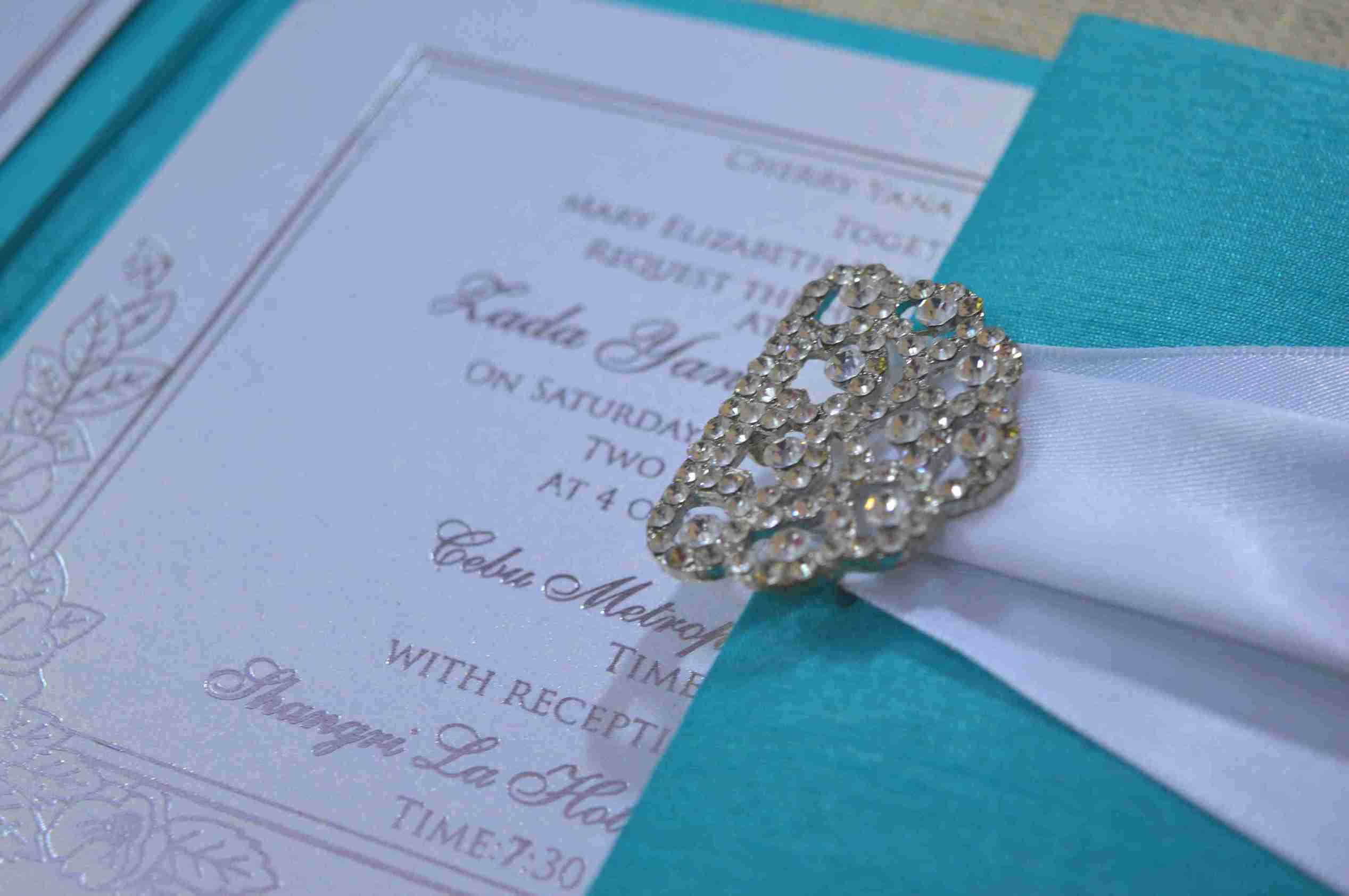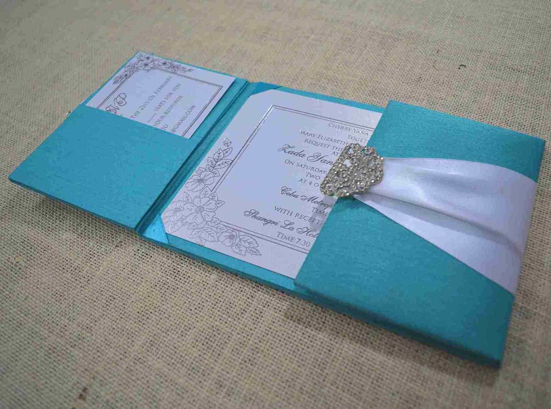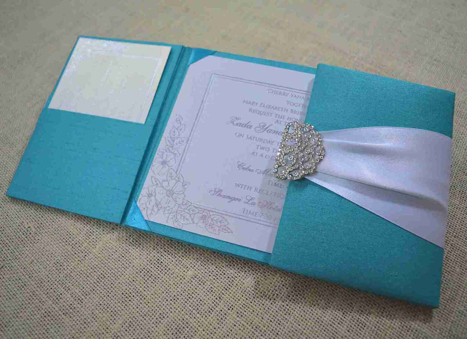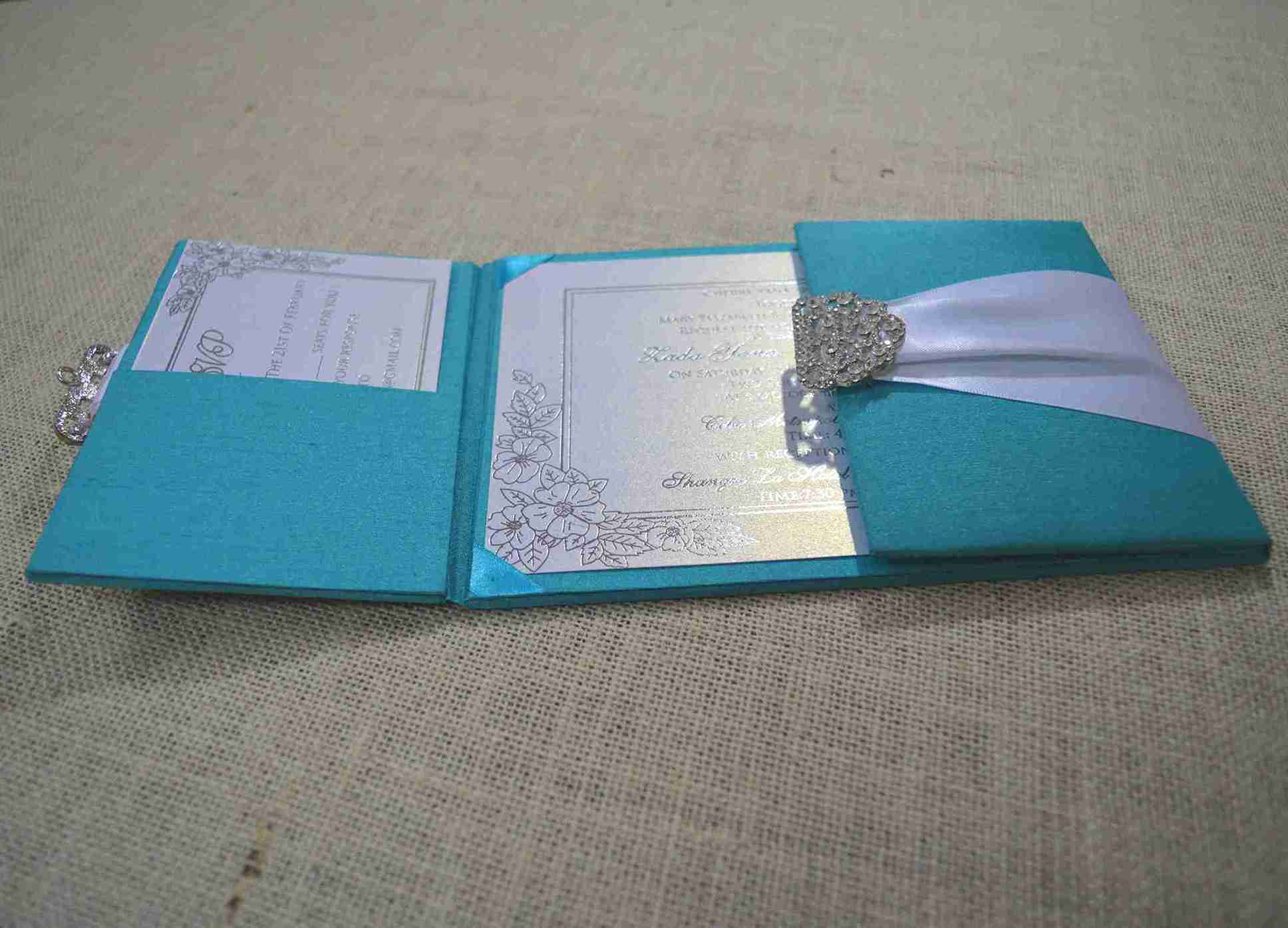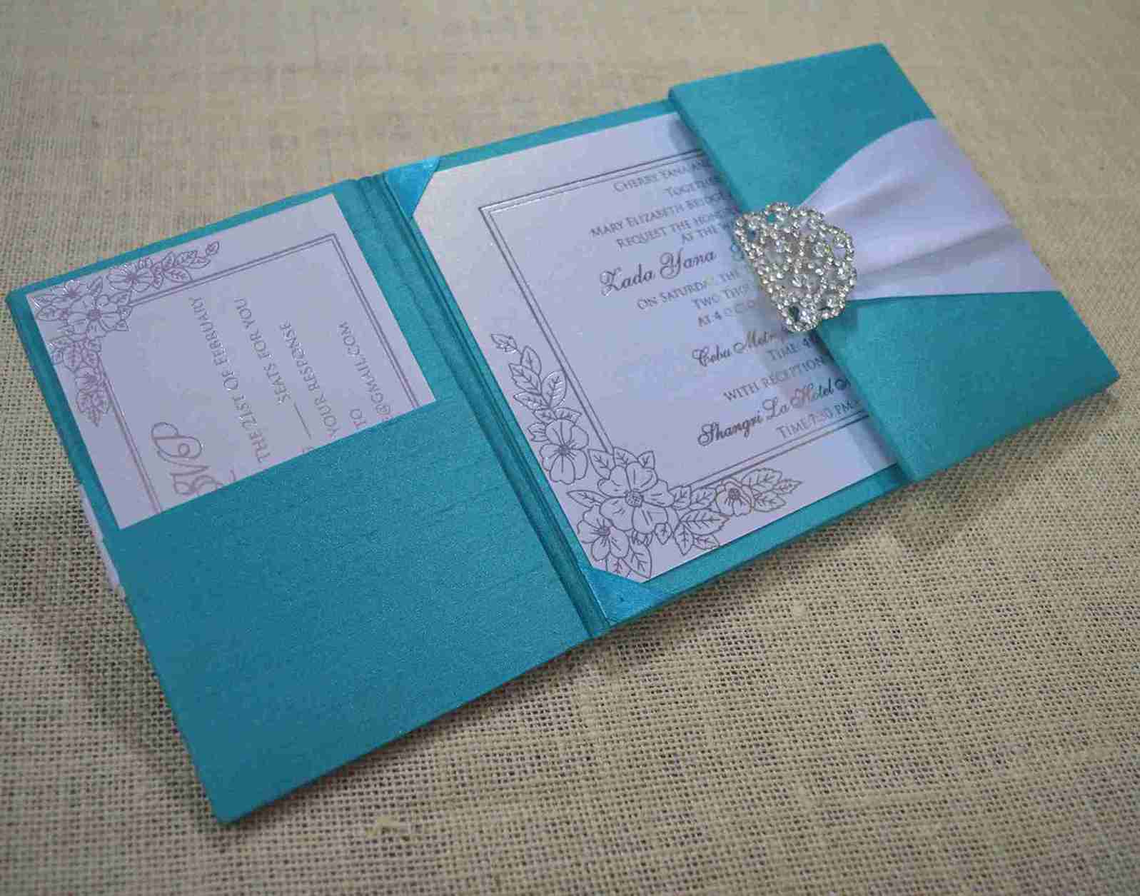 πβππ πππππβπΎ πββπππ»πΌπ: A gate-fold silk wedding invitation folio with a double trim satin ribbon and a crystal rhinestone buckle brooch. This silk folio comes with a pearl shimmery cardstock and foil printed invitation. There are two pockets inside the folio gates for additional enclosure cards.