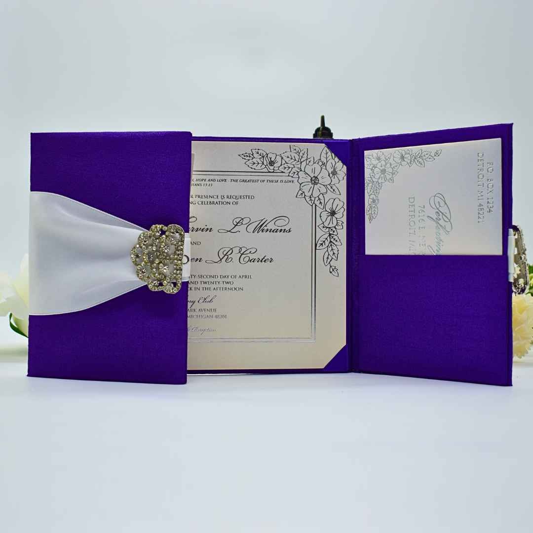 Violet Silk Wedding Invitation Folio with White Ribbon & Crystal Brooch