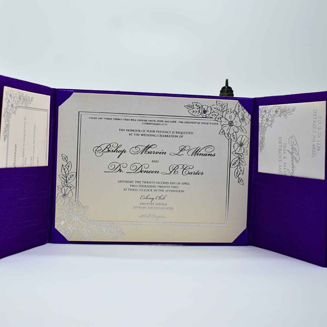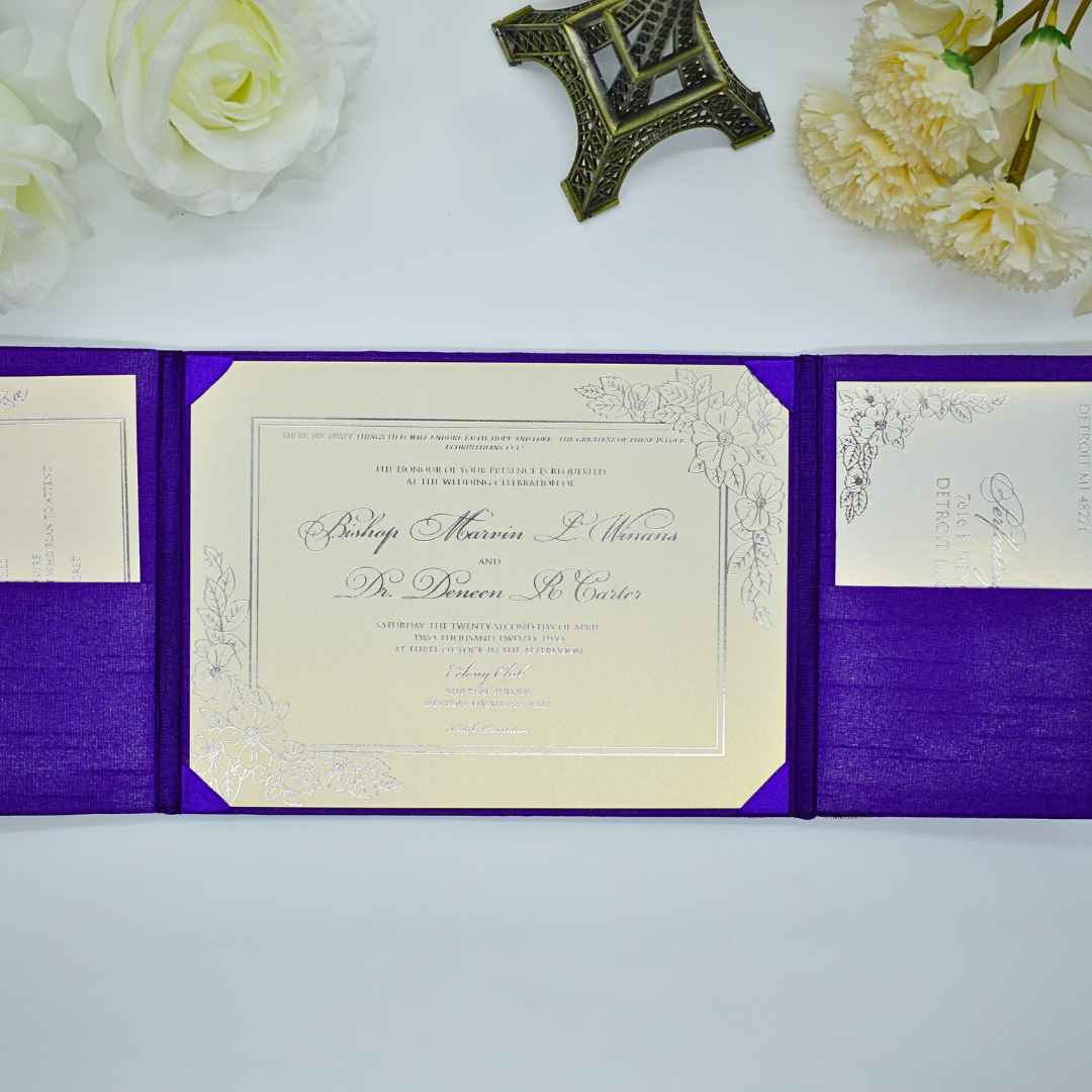 This opulent violet silk wedding invitation folio evokes the mystery of a starlit sky. Crafted from sumptuous dupioni silk, its gate-fold design unfurls like the night revealing its secrets. A double-trim white satin ribbon, secured by a twinkling rhinestone buckle, adds celestial sparkle. Inside, a hot foil-printed cardstock insert nestles in midnight luxury, promising a celebration as magical as the cosmos.