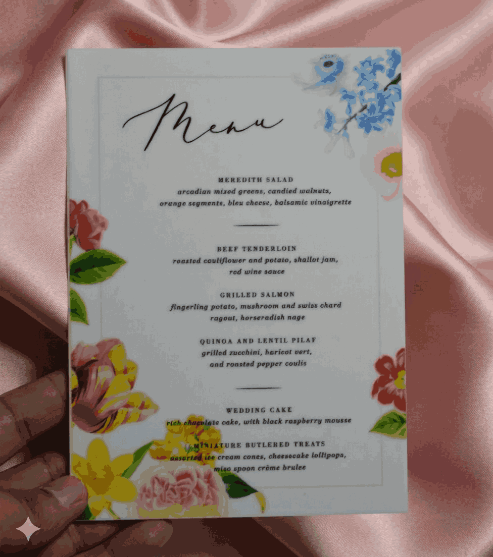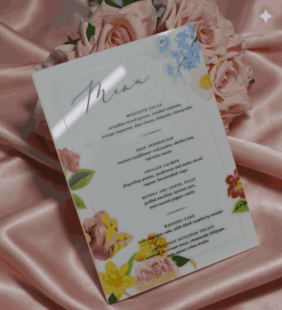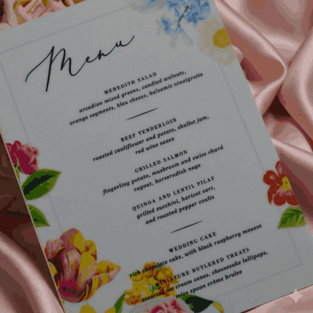 πβππ πππππβπΎ πββπππ»πΌπ: An acrylic wedding dinner menu with digitally printed floral artwork details.