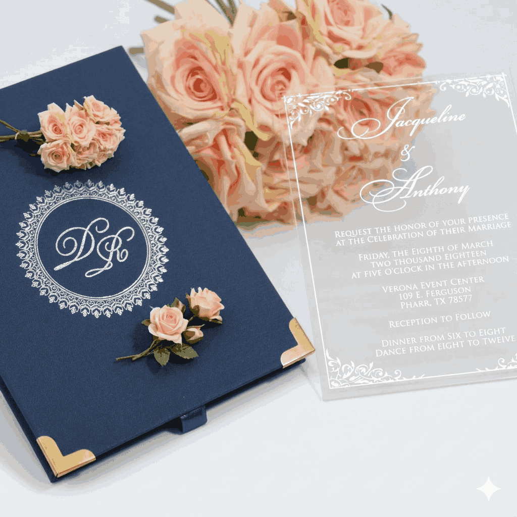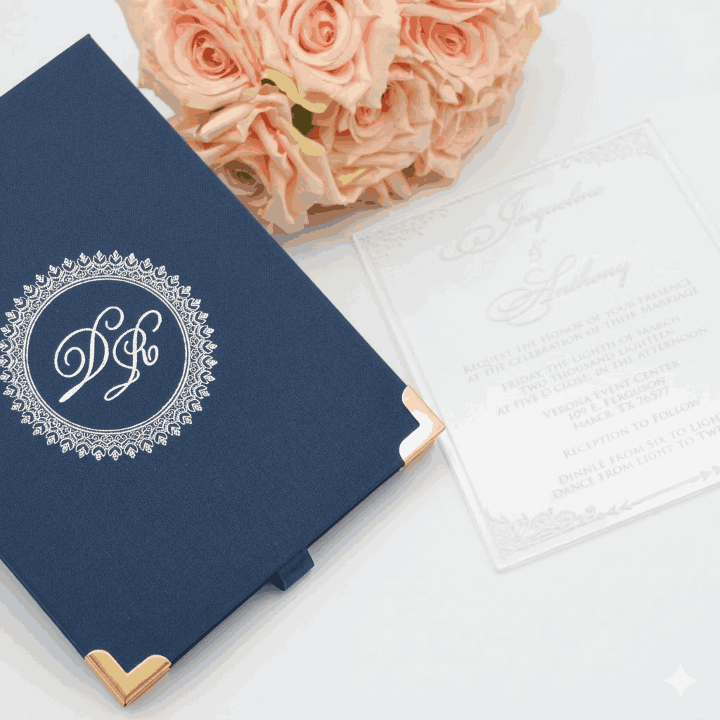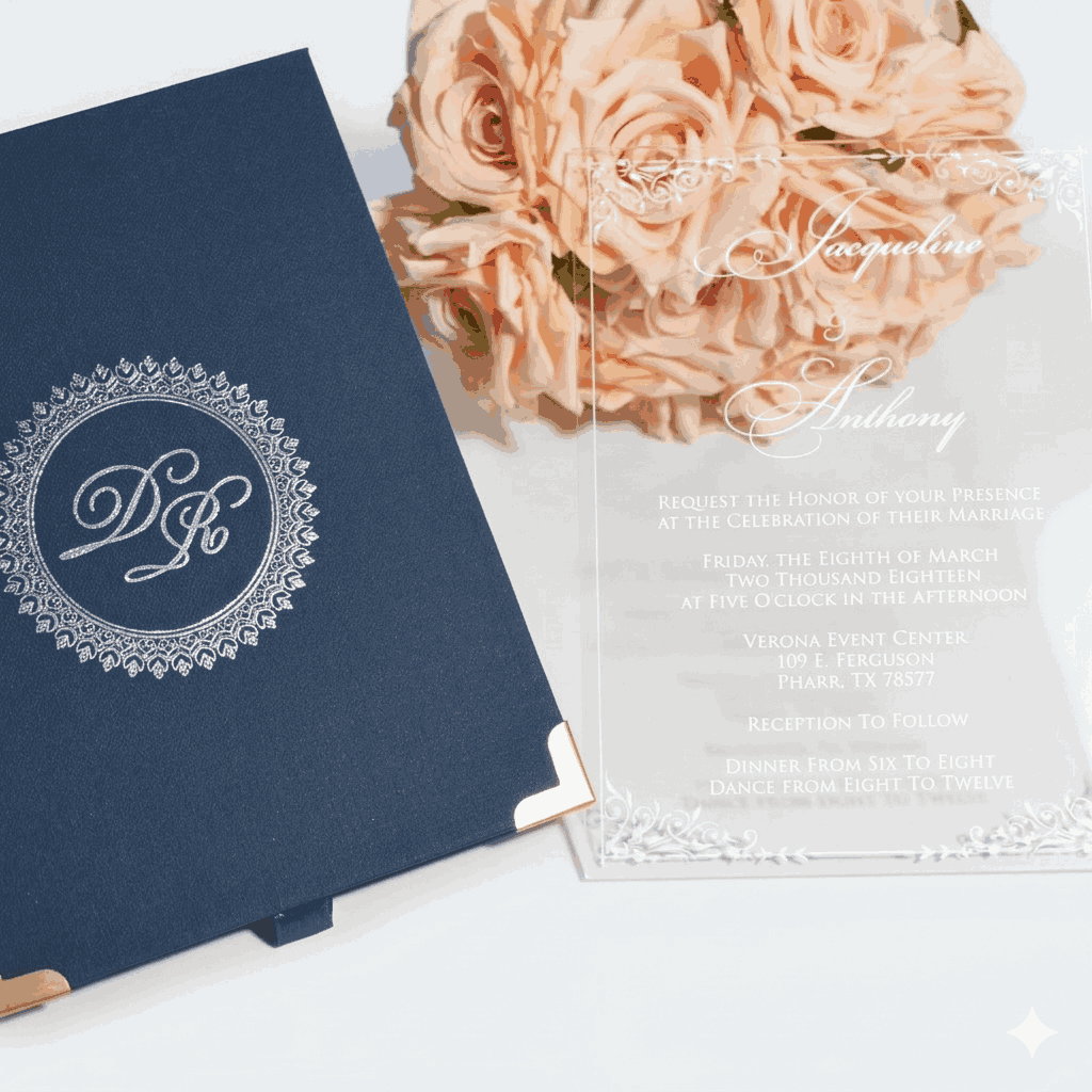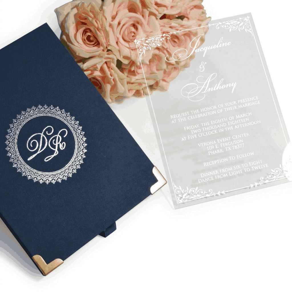 πβππ πππππβπΎ πββπππ»πΌπ: A wedding invitation box with a custom foil monogram and a clear acrylic invite. The box has a pocket inside the lid for additional inserts.