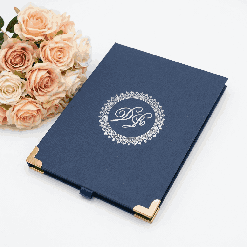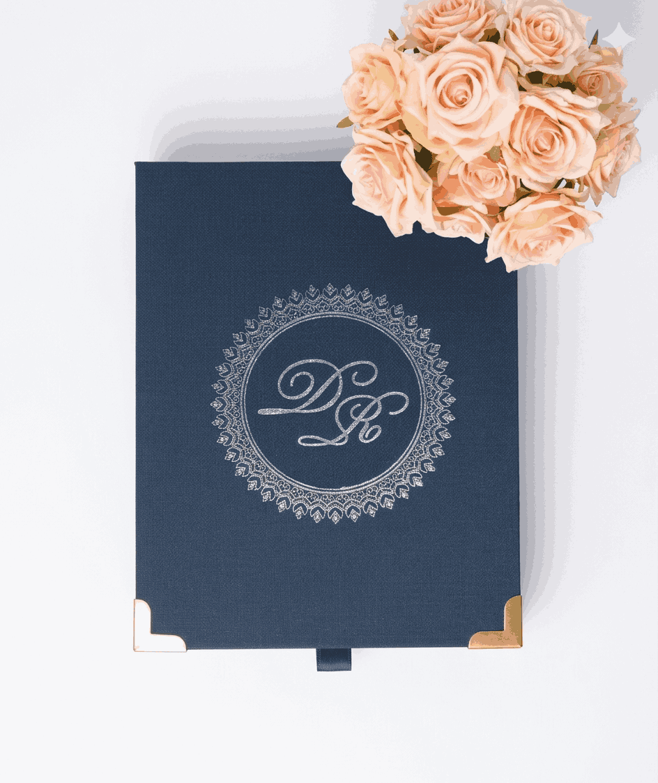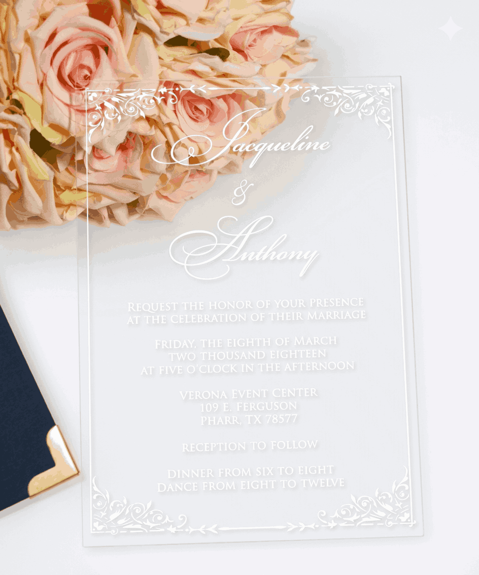 πβππ πππππβπΎ πββπππ»πΌπ: A wedding invitation box with a custom foil monogram and a clear acrylic invite. The box has a pocket inside the lid for additional inserts.