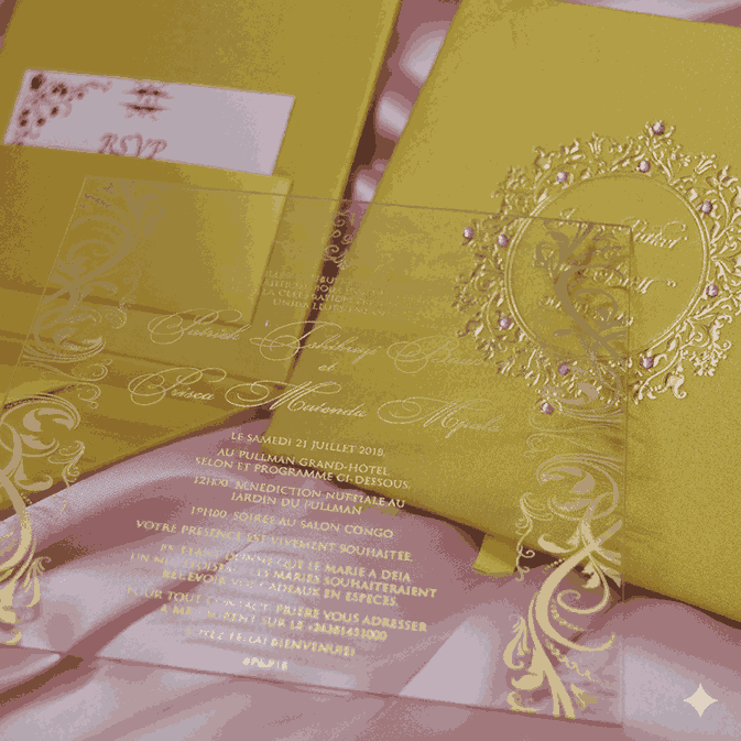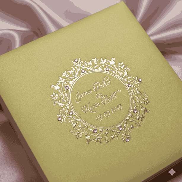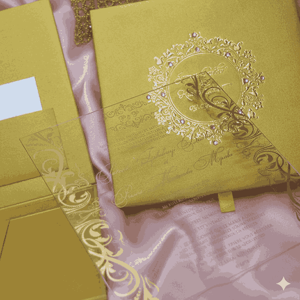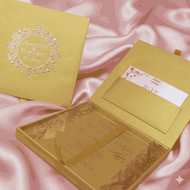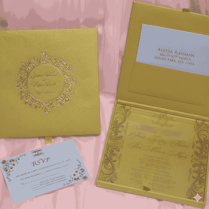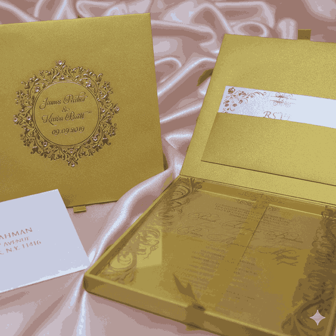 πβππ πππππβπΎ πββπππ»πΌπ: A wedding invitation box made of MDF and finished with pearl shimmery gold paper. The box has a customized foil monogram which is adorned with clear rhinestones. The box also has a hinged lid with pocket inside for additional enclosure cards. This beautiful wedding invitation box comes with a clear acrylic invitation.