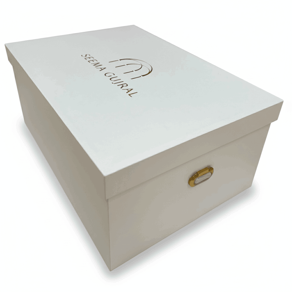 The exterior is finished in a sophisticated  pearl shimmery paper, featuring your custom foiled logo for a premium branded touch. Inside, a plush Dupioni silk lining ensures snag-free protection, making it the ideal storage wedding lehenga solution for heirloom pieces. Equipped with premium gold handles, this bridal lehenga box combines durability with couture aesthetics, offering an unmatched unboxing experience for your discerning clientele.