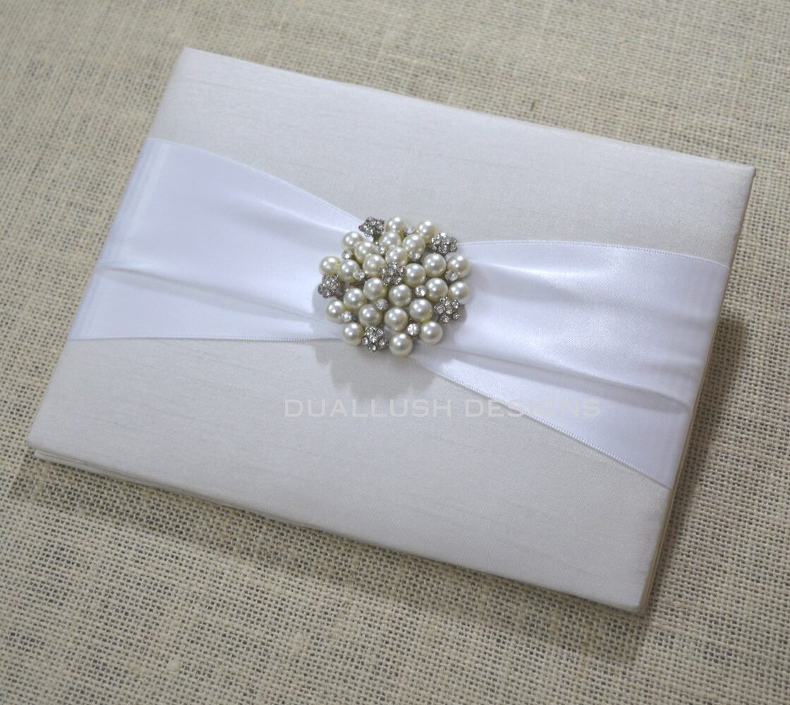 𝕋ℍ𝕀𝕊 𝕃𝕀𝕊𝕋𝕀ℕ𝔾 𝕀ℕℂ𝕃𝕌𝔻𝔼𝕊: A bi-fold faux silk wedding invitation folio with a doubel trim satin ribbon, embellished with a pearl and crystal rhinestone brooch. This bi-fold folio has a pearl shimmery cardstock invitation insert. The silk folio has a pocket for additional enclosure card inserts.