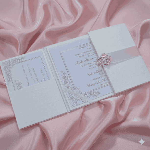 πβππ πππππβπΎ πββπππ»πΌπ: A gate-fold silk wedding invitation folio with a double trim satin ribbon and crystal rhinestone buckle brooch. The silk folio has a foil printed, pearl shimmery invitation insert card in the center and there are pockets inside both the gates for additional enclosure cards.