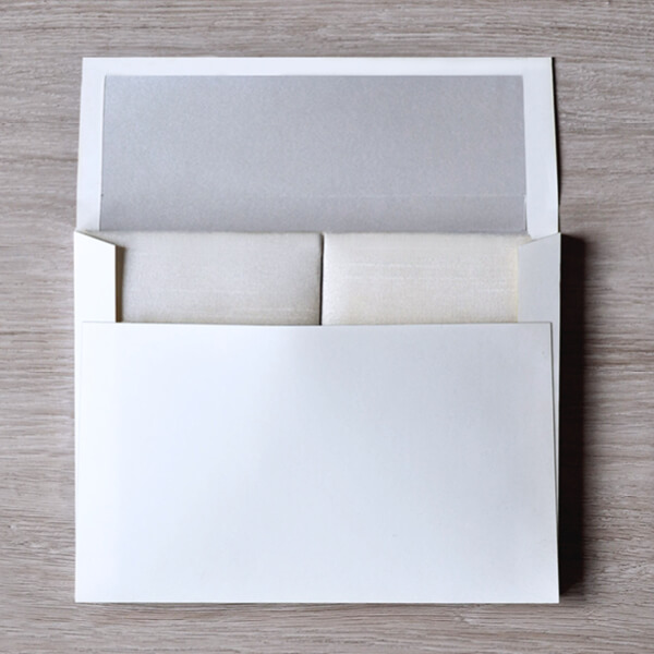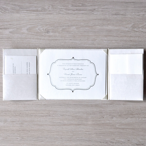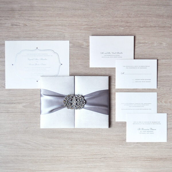 𝕋ℍ𝕀𝕊 𝕃𝕀𝕊𝕋𝕀ℕ𝔾 𝕀ℕℂ𝕃𝕌𝔻𝔼𝕊: A gate-fold silk wedding invitation folio with a double trim satin ribbon and crystal rhinestone buckle brooch. The silk folio has a foil printed, pearl shimmery invitation insert card in the center and there are pockets inside both the gates for additional enclosure cards.