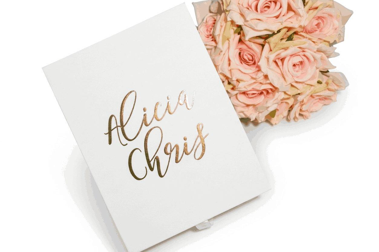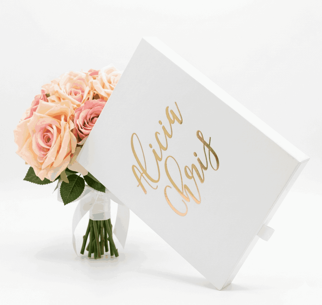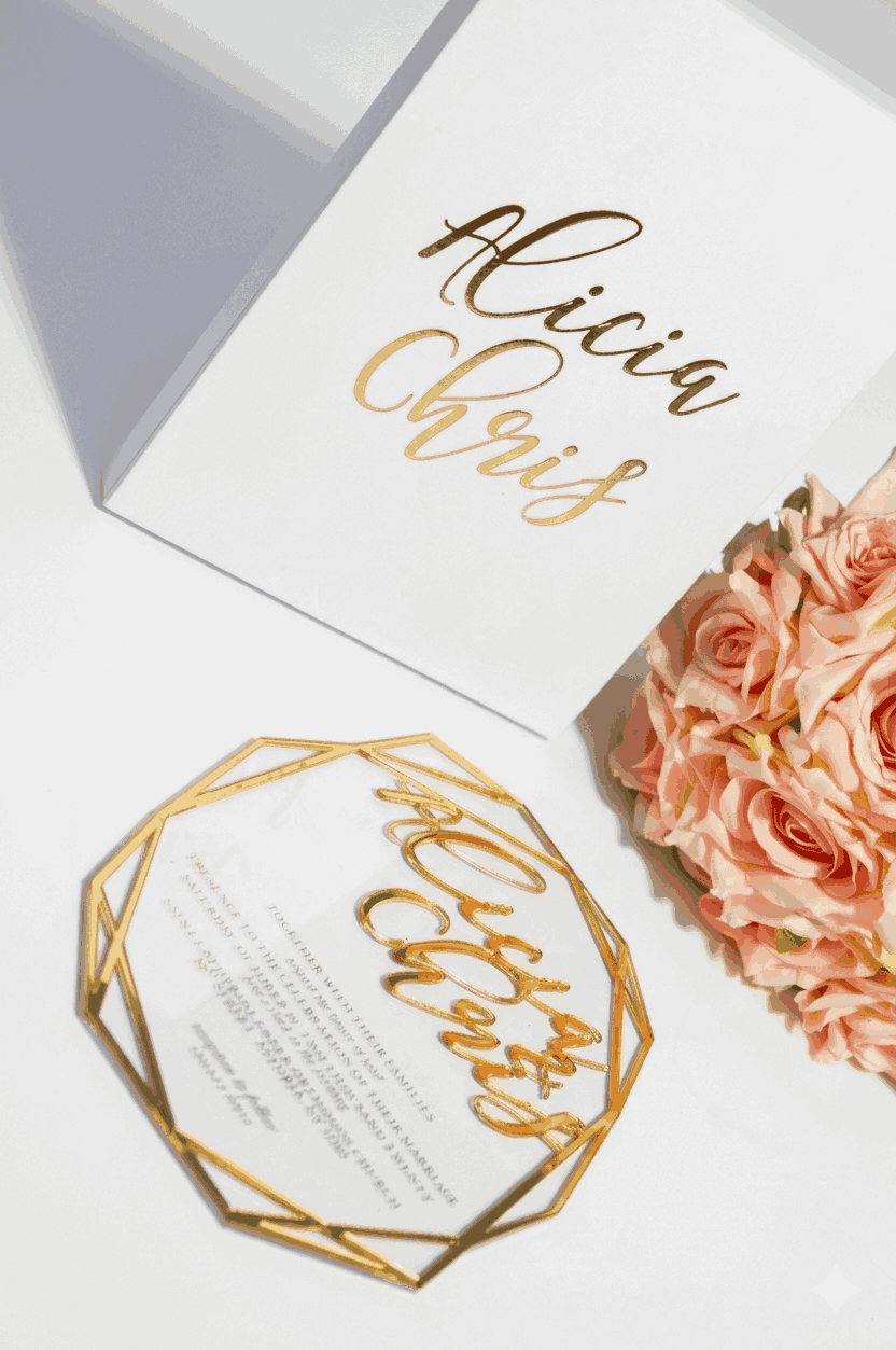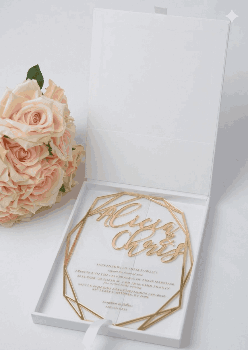 πβππ πππππβπΎ πββπππ»πΌπ:Β A hinged lid wedding invitation box with a hot foil monogram. The box comes with a clear and mirror acrylic laser-cut invitation. The box has a pocket inside the lid for additional enclosure card inserts.