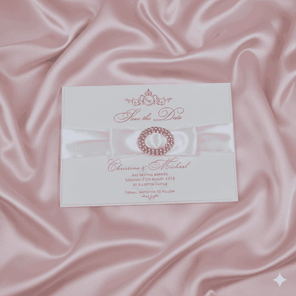 Ivory Silk Save the Date Card with Rhinestone Brooch