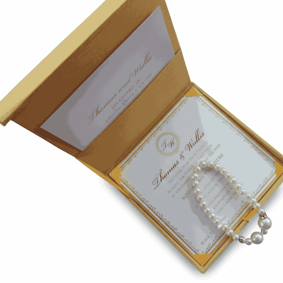 Luxury Gold Silk Wedding Invitation Box with Pearl Brooch