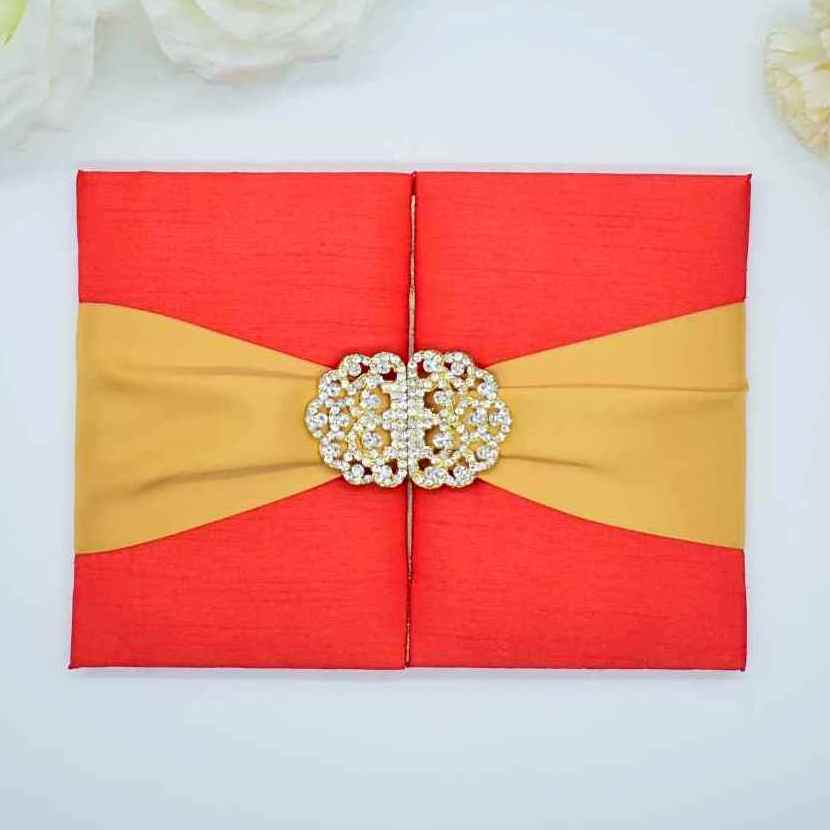 Red Silk Wedding Invitation Folio with Gold Ribbon & Crystal Brooch