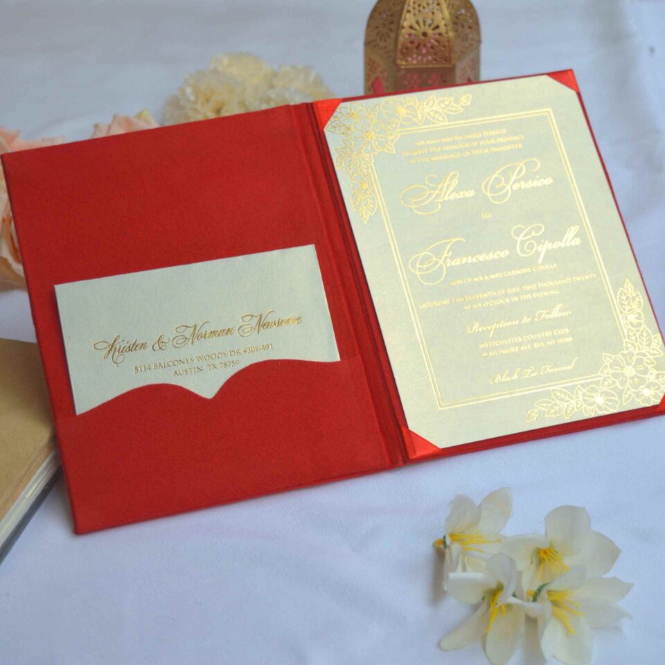Red Velvet Wedding Invitation Folio with Custom Foil Monogram