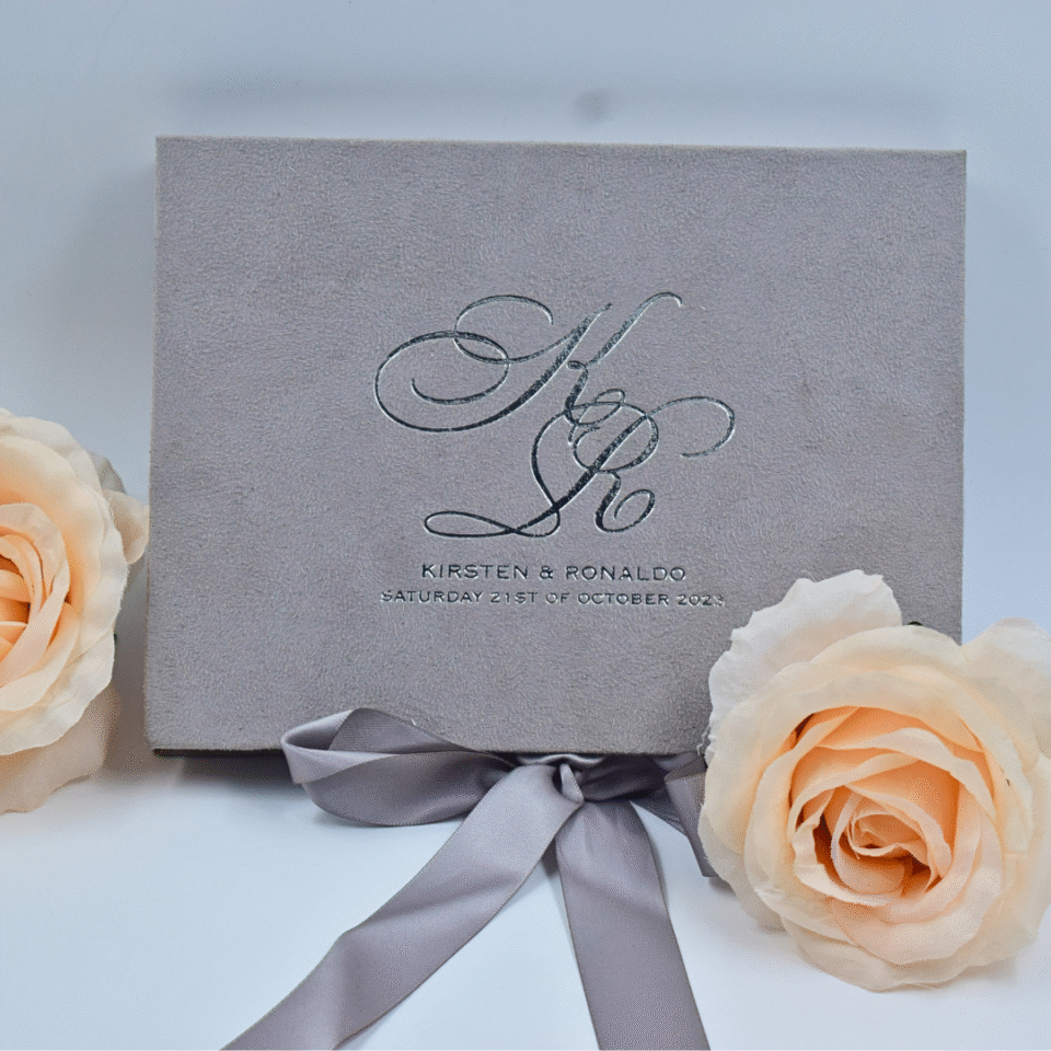 Grey Velvet Wedding Invitation Folio: Custom Foil Monogram